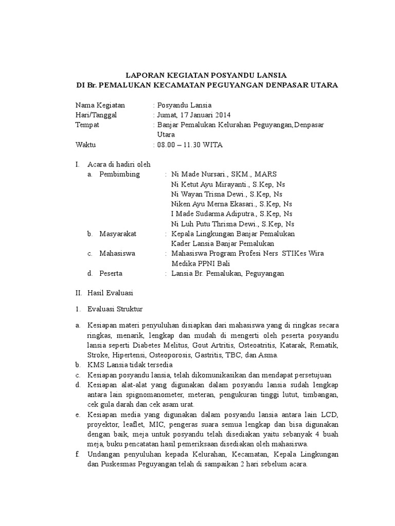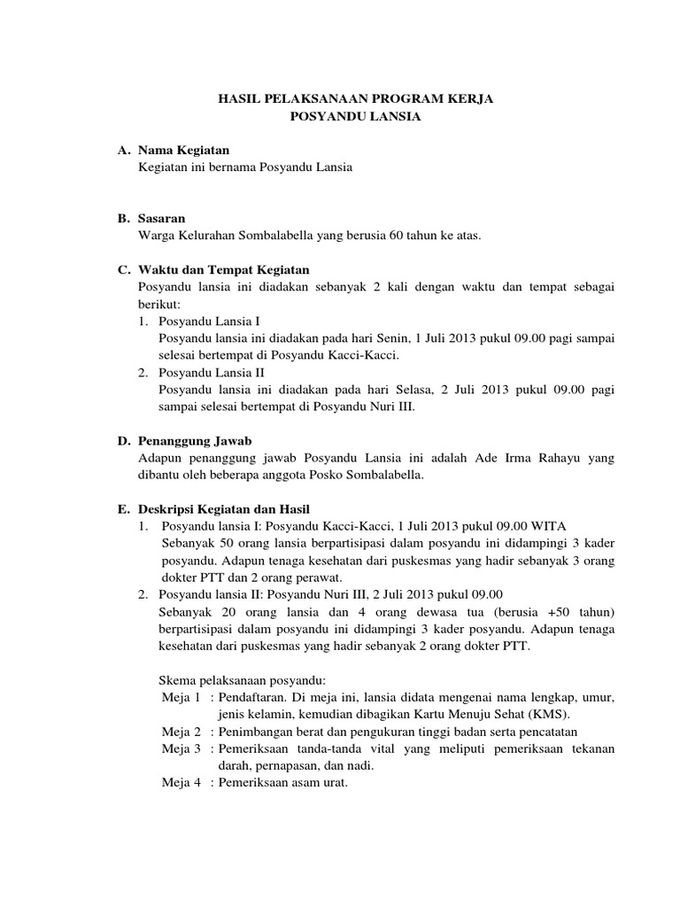 Contoh laporan kegiatan posyandu lansia. Kegiatan posyandu kegiatan posyandu yaitu melayani balita ibu hamil dan wus pus untuk meningkatkan angka kesehatan ibu dan bayi melaksanakan imunisasi vaksin kb melakukan penyuluhan kepada masyarakat dalam pencegahan penyakit dan lain lain. Adanya kejelasan tugas dan alur kerja yang jelas serta dipahami oleh kader posyandu. Contoh laporan singkat kegiatan jika kita bekerja pada sebuah institusi atau berorganisasi di sekolah setiap kegiatan yang diselenggarakan baik itu kegiatan pelatihan bakti sosial pramuka lomba 17 agustus dan acara acara lainnya pasti selalu dimintai pertanggungjawabannya entah itu berupa laporan tertulis ataupun dokumentasi berupa foto. Kia kesehatan ibu dan anak. Penyebab tidak terlaksananya kegiatan rutin bulanan posyandu disamping jumlah kader yang terbatas dapat pula karena belum siapnya masyarakat. Posyandu lansia adalah pos pelayanan terpadu untuk masyarakat usia lanjut di suatu wilayah tertentu yang sudah disepakati.