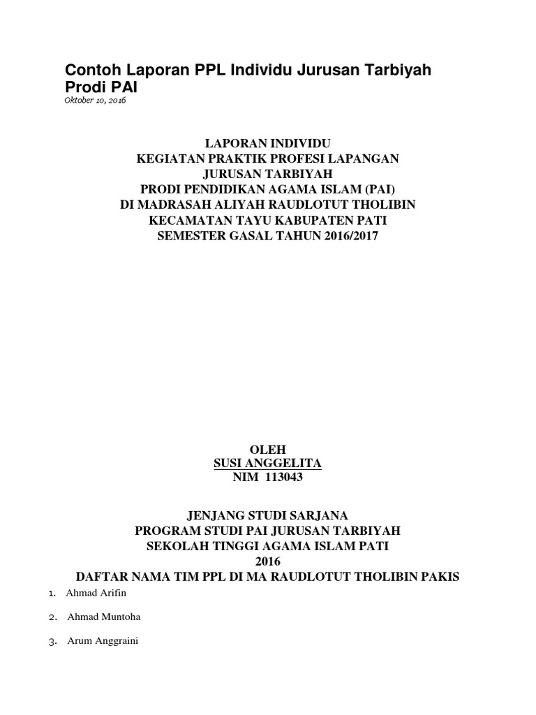 Contoh laporan kkn jurusan pai yang bisa bapakibu gunakan dan diunduh secara gratis dengan menekan tombol download biru dibawah ini. Tenaga pengajar memperoleh berbagai kasus yang dapat digunakan sebagai contoh dalam proses pendidikan. Pengesahan laporan kuliah kerja nyata di kelurahandesa hadiwarno kecamatan ngadirojo kabupaten pacitan disusun oleh. Tujuan yang ingin dicapai dari pemberdayaan adalah untuk membentuk individu dan masyarakat menjadi mandiri. Bimbingan belajar pai dan sejarah kebudayaan islam bagi siswa mi darus sholah dilaksanakan setiap hari selasa pukul 0700 wib. Laporan individu kuliah kerja nyata kkn di desa hadiwarno kecamatan ngadirojo kabupaten pacitan oleh.