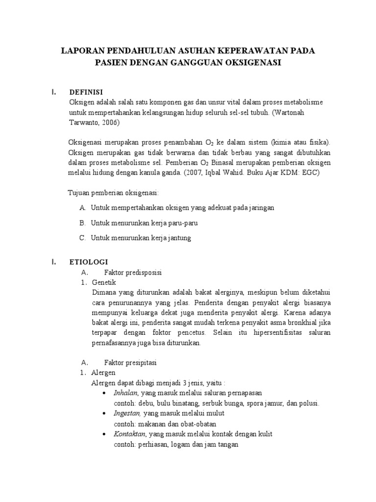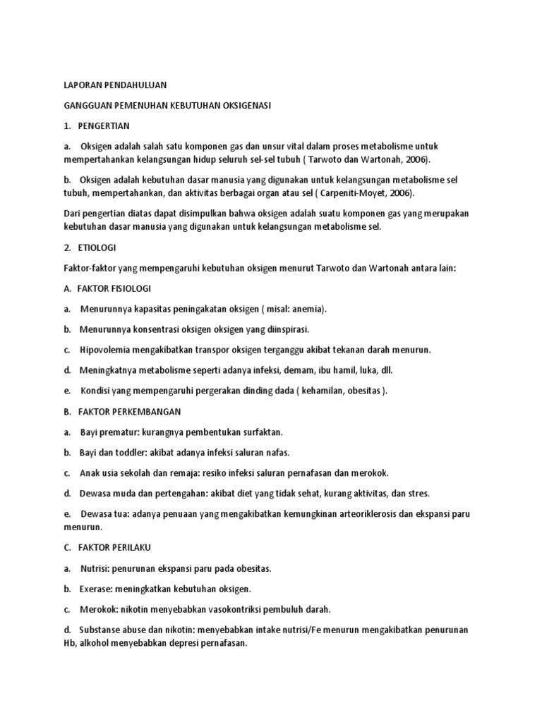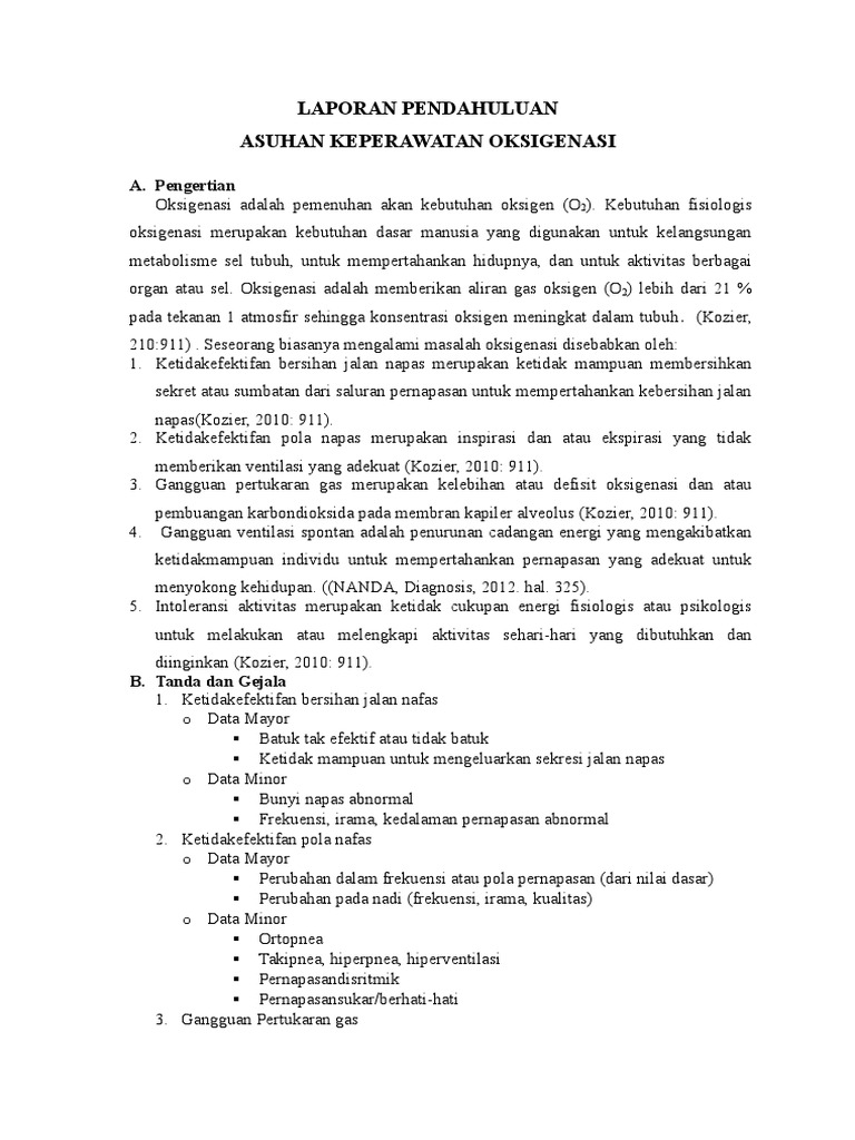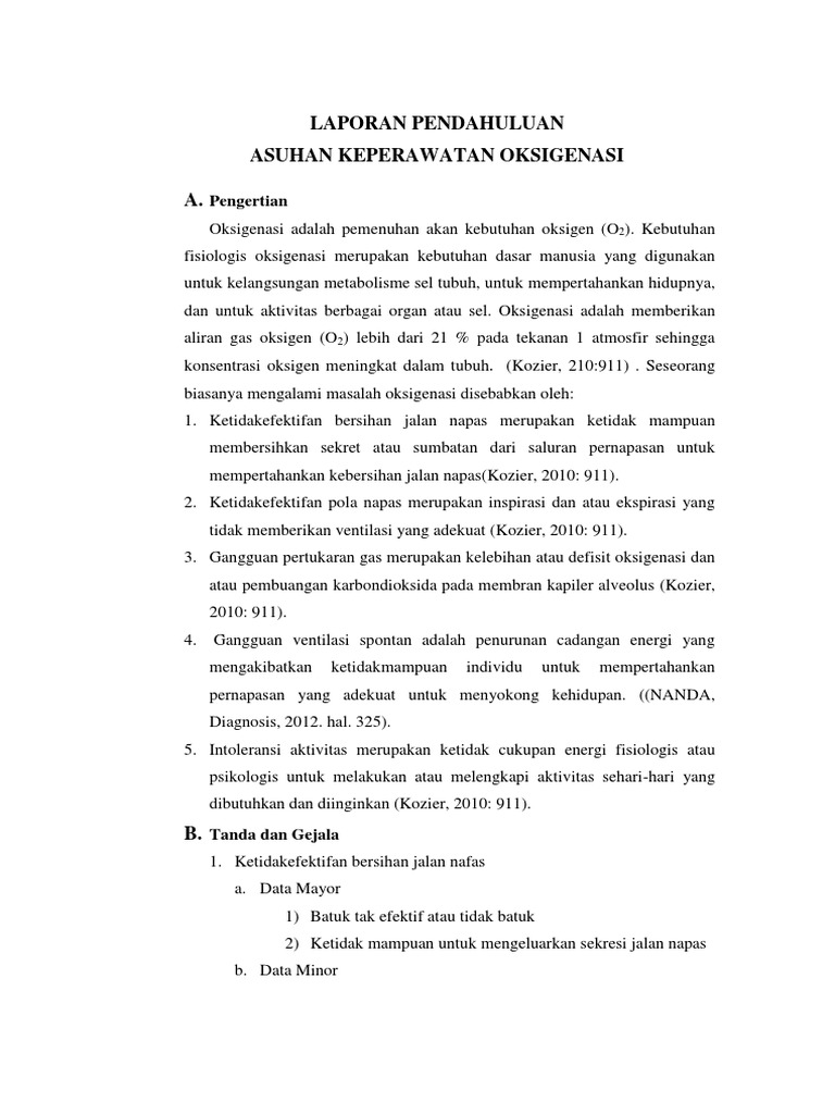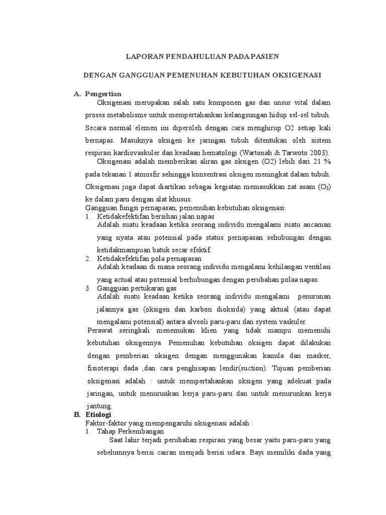 Di ruang kenanga rsud goetheng tarunadibrata. Defenisi oksigen adalah salah satu komponen gas dan unsur vital dalam proses metabolisme untuk mempertahankan kelangsungan hidup seluruh sel sel tubuh tarwoto dan wartonah 2006. 1bersihan jalan nafas tidak efektif berhubungan dengan penumpukan secret berlebih ditandai dengan sesak nafas dan rr 35x menit 2. Laporan pendahuluan kebutuhan oksigenasi a. Laporan pendahuluan oksigenasi a. Papers ini berisi tentang asuhan keperawatan dengan diagnosa keperawatan.