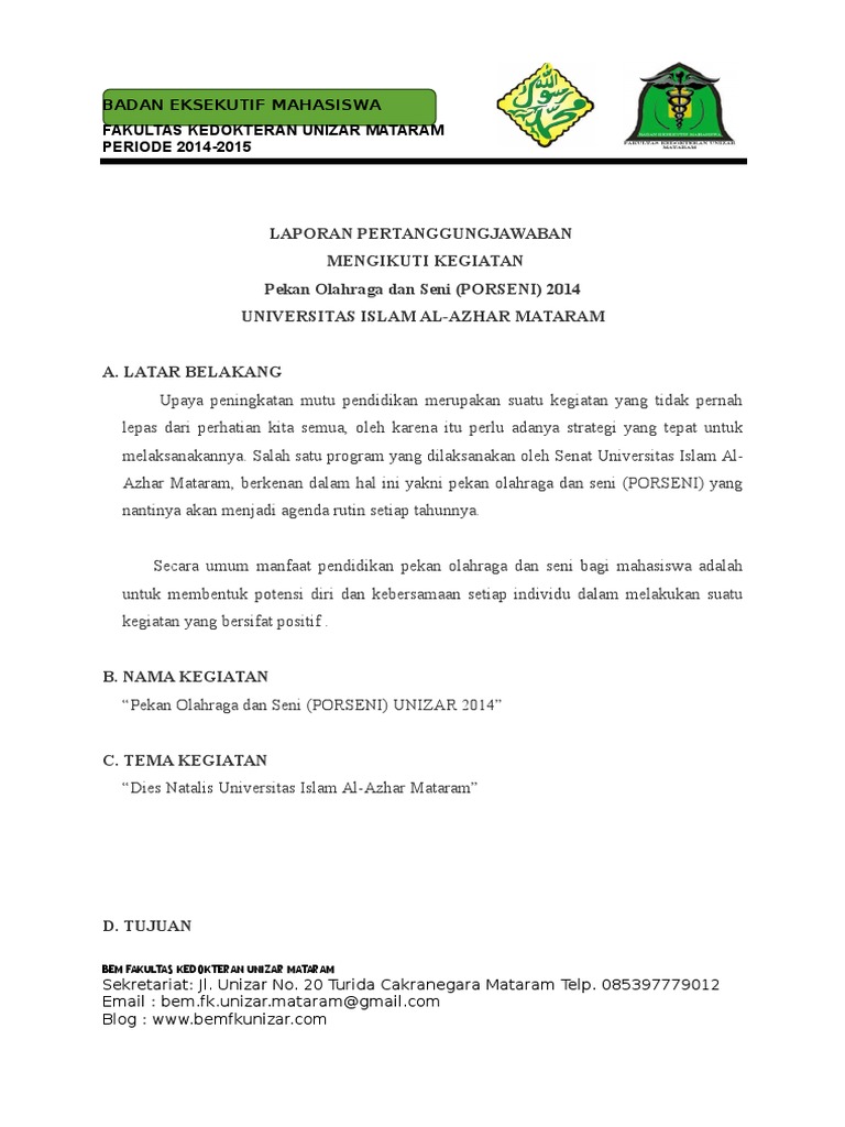 Contoh laporan pertanggungjawaban kegiatan olahraga. Segala puji dan syukur kita marilah kita ucapkan kepada sang pemilik arsy yang telah melimpahkan rahmatnya kepada kita semua sehingga kita dapat berkumpul di tempat yang barokah ini guna untuk mendengarkan laporan pertanggungjawaban tiap tiap bagian oprh. Academiaedu is a platform for academics to share research papers. Open talk ketua panitia. Kotak saran online dan offline 2. Selasa 31 oktober 2017 tempat kegiatan. Ruang kuliah 1 fakultas farmasi universitas.