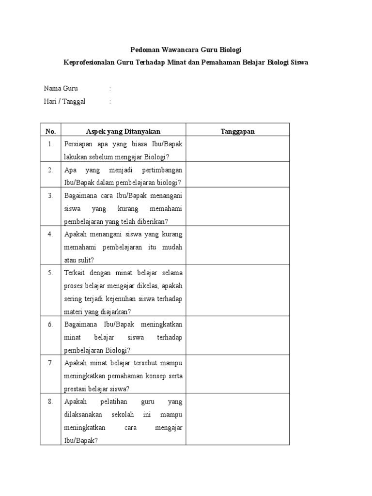 Contoh lembar wawancara untuk guru. Baik secara prilaku kebiasaan dan adiministrasi jugamenyesuaikan protokol baru ini. Untuk itu guru atau pendidik dituntut untuk lebih cepat tangggap mengahadi kondisi seperti ini terutama yang berada di daerah berzona merah. Seperti yang sudah sudah sebelum instrumen ptk tersebut di atas ditampilkan. Rpp akuntansi dasar smk indonesia 1 lembar. Pembelajaran 9 kejelasan penyajian konsep 10 memberi contoh konkrit dalam kejadian yang ada dalam kehidupan sesuai dengan yang diperagakan 11 memberikan motivasi dan. Nah itu tanggung jawabnya melatih kedisiplinan sopan santun jadi tanggung jawab seorang guru.