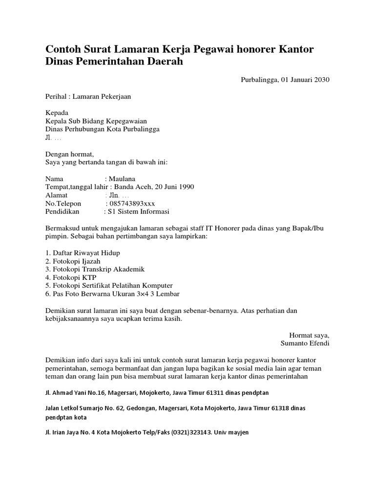 Contoh surat lamaran kerja pada artikel ini kita akan membahas contoh surat lamaran pekerjaan yang dapat kamu dapatkan beserta file doc nya. Surat lamaran kerja adalah surat yang digunakan untuk melakukan permohonan mendapatkan pekerjaan sesuai pengalaman pada perusahaan tertentu. Surat lamaran pekerjaan dapat juga didefinisikan sebagai surat dari calon karyawan kepada calon majiakan yang berisi permintaan agar calon karyawan diberi pekerjaan oleh calon majikan. Contoh surat lamaran kerja di perusahaan seringkali dicari oleh para pencari kerja yang ingin mengajukan lamaran pekerjaan di perusahaan perusahaan yang ada di indonesia. Cv merupakan aspek penting pertama yang dapat membuat surat lamaran kerja terlihat menjualmenarik di mata hrd. Sekilas tentang cv daftar riwayat hidup.