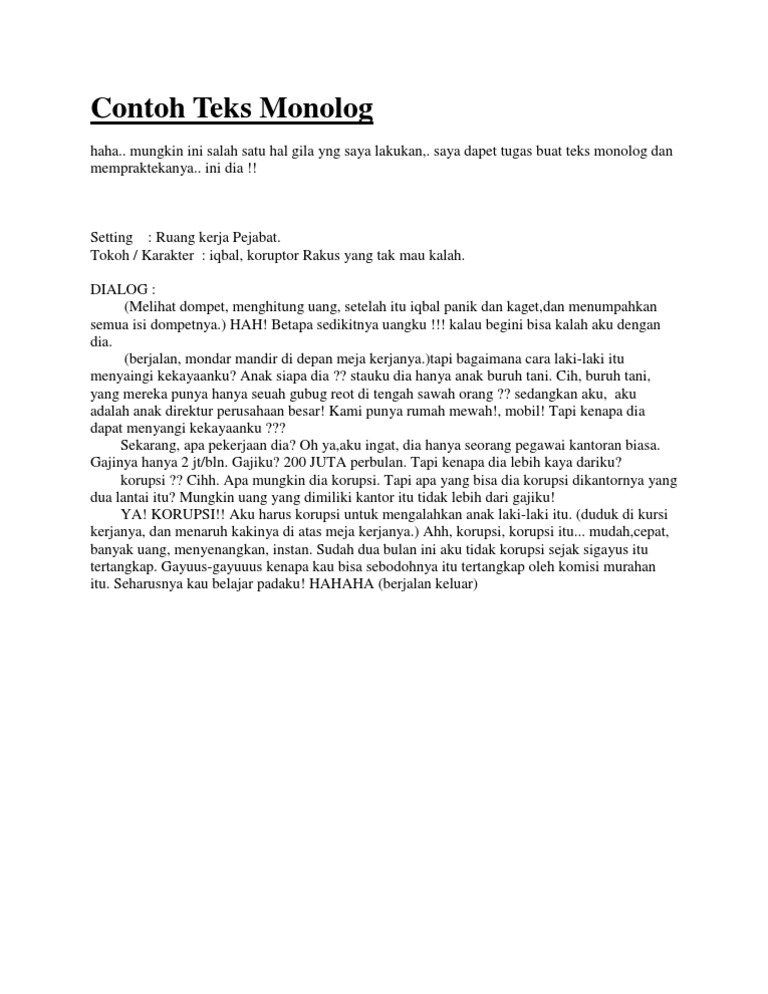 Contoh naskah monolog sederhana. Kumpulan naskah drama monolog 13 januari 2012 1757 diperbarui. Contoh teks monolog monolog merupakan istilah dalam bidang keilmuan yang diambil dari kata mono yang memiliki arti satu dan log dari kata logi yang memiliki arti ilmu. Secara harfiah monolog merupakan sebuah ilmu terapan yang berkaitan dengan seni peran dimana hanya membutuhkan satu orang saja atau dialog bisu untuk sebuah adegan. Naskah drama monolog sederhana ini sudah diacc dan pernah saya pakai sebagai bahan ujian praktik. Teks drama monolog dibuat sebagai bekal bagi sang aktornya untuk membawakan peran dan mengungkapkan pesan yang ingin disampaikan kepada penonton. Naskah adalah 11 pengertian menurut para ahli jenis tata cara bagian dan contoh untuk pembahasan kali ini kami akan mengulas mengenai naskah yang dimana dalam hal ini meliputi.