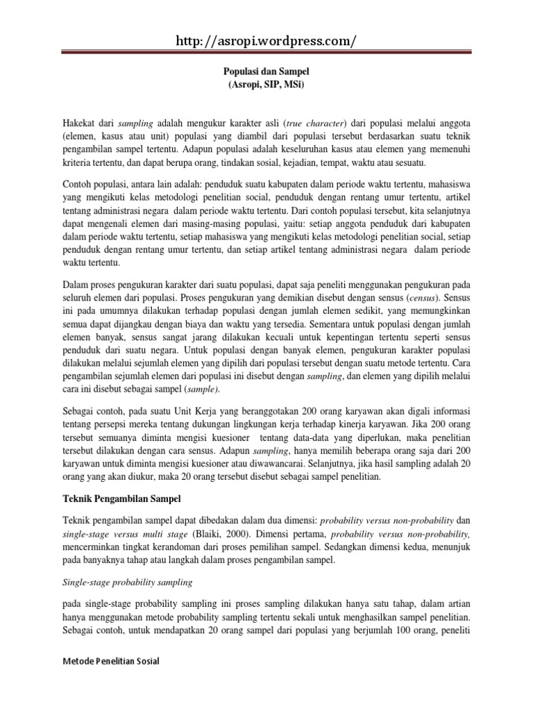 Teknik sampling probabilitas probability sampling technique teknik ini dinamakan probabilitas karena dalam proses pengambilannya ada peluang yang sama yang dimiliki individu untuk mendapakan kesempatan menjadi sampel penelitian. Non probability sampling is defined as a sampling technique in which the researcher selects samples based on the subjective judgment of the researcher rather than random selection. Probability sampling non probability sampling teknik pengambilan sampel atau teknik sampling adalah suatu cara mengambil sampel yang reprensif dari populasi. Berdasarkan pengertian para ahli diatas maka kami menyimpulkan bahwa pengertian teknik sampling acak sederhana adalah suatu teknik pengambilan sampel atau elemen secara acak dimana setiap elemen atau anggota populasi memiliki kesempatan yang sama untuk terpilih menjadi sampel. It is a less stringent method. Artikel ini akan membahas secara detal mengenai probability sampling dan non probability sampling.