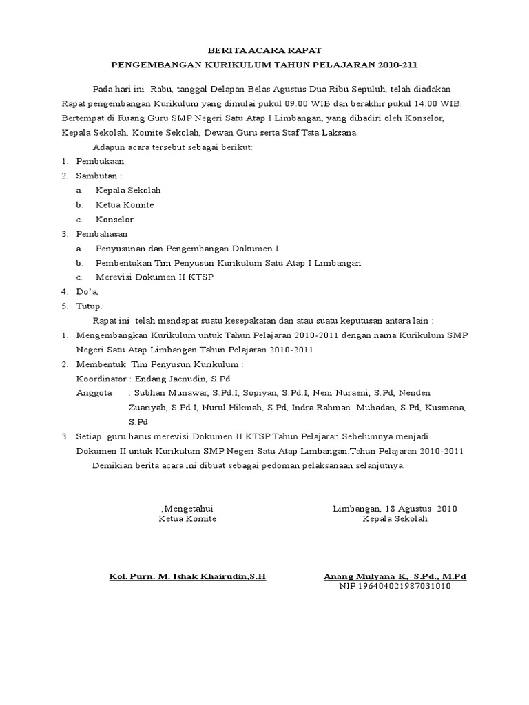 Manfaat berita acara rapat sekolah adalah sebagai dokumen bukti telah dilaksanakannya rapat di. Contoh berita acara rapat pengembangan kurikulumdoc. Notulen rapat visi misidocx. Contoh notulen rapat review kurikulum pengembangan kurikulum dan evaluasi diri sekolah eds sdmi smpmts smamasmk dalam pengembangan dan review kurikulum perlu diadakan rapat yang di dalamnya harus diadministrasikan dalam bentuk notulen. Jika teks url blogweb atau isi di daftar tamu itu diperbolehkan terima kasih. Oleh sebab itu maka dalam rapat kurikulum ktsp mesti dihadiri oleh sekretaris selaku notulen kepala selaku pimpinan dan komite selaku pengawas.
