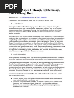 Epistemologi atau teori pengetahuan yang membahas bagaimana kita memperoleh pengetahuan ontologi atau teori hakikat yang membahas tentang hakikat segala sesuatu yang melahirkan pengetahuan dan aksiologi atau teori nilai yang membahas tentang guna pengetahuan. Epistemologi atau teori pengetahuan adalah cabang filsafat yang berurusan dengan hakikat dan linkup pengetahuan pengandaian pengandaian dan dasar dasarnya serta pertanggung jawaban atas pernyataan mengenai pengetahuan yang dimiliki. Ketiga cabang tersebut merupakan ontology epistemologi dan aksiologi.