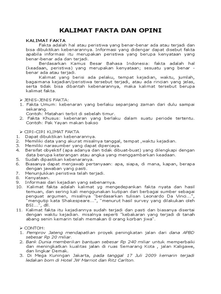 Itulah pengertian fakta dan pengertian opini serta perbedaan fakta dan opini beserta contoh kalimatnya. Demikianlah tentang pengertian jenis ciri ciri kalimat fakta dan opini beserta contohnya. Contoh kalimat fakta. Pengertian fakta merupakan suatu kejadian maupun keadaan yang benar benar terjadi dan bukan mitos serta pernah dilihat oleh mata kepala manusia itu sendiri atau telah dilakukan suatu pengujian dan pemastian di khalayak umumnya. Saya sekolah di smp negeri 4 bandar lampung bila saat ini kamu bersekolah di smp 4 bandar lampung adalah suatu kebenaranfakta namun. Namun keduanya dapat disandingkan penggunaannya dalam membahas masalah masalah tertentu.