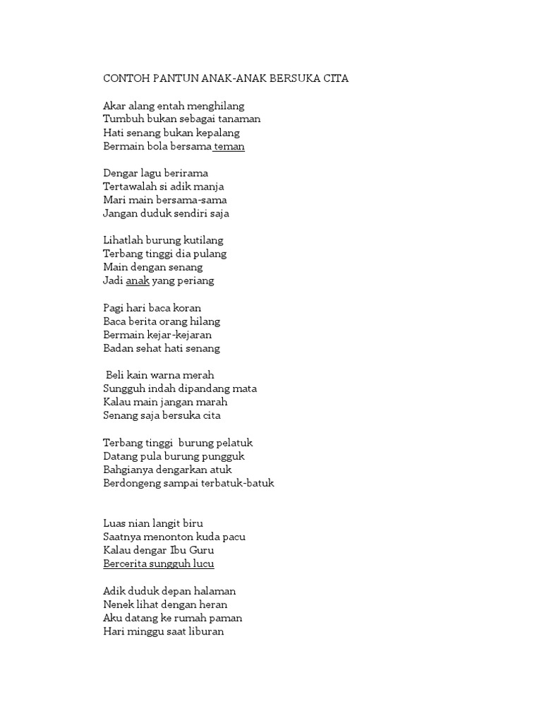 Orang tersebut spesial bagi kita yang biasa kita menyebutnya dengan sahabat. Atau cek fb kami disini. Pantun anak anak merupakan salah satu karya sastra yang dipelajari dalam mata pelajaran bahasa indonesia. Dalam bahasa jawa misalnya dikenal sebagai parikan dan dalam bahasa sunda dikenal sebagai paparikan. Pantun merupakan salah satu jenis puisi lama yang sangat luas dikenal dalam bahasa bahasa nusantara. Siapa sih yang tidak suka suasana bahagia senang gembira riang dan sebagainya.