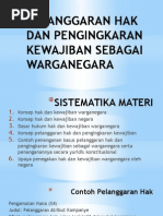 Kasus kasus pelanggaran hak dan pengingkaran kewajiban disebabkan oleh faktor faktor tertentu dan tidak jarang kasus kasus tersebut tidak dapat terselesaikan oleh hukum di indonesia. ø contoh pengingkaran kewajiban di indonesia pengingkaran kewajiban warga negara banyak sekali bentuknyamulai dari yang sederhana sampai yang berat diantaranya adalah. Hak berserikat dan berkumpul. Melanggar hak asasi manusia lain. Hak mengeluarkan pikiran berpendapat. Berbagai kasus pelanggaran hak dan pengingkaran kewajiban warga negara indonesia terus saja terjadi meski negara telah mengantisipasinya dengan berbagai cara.