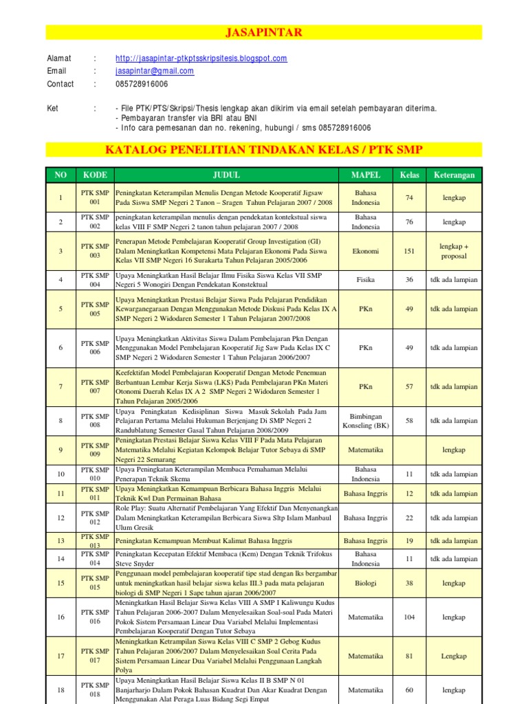Contoh penelitian tindakan kelas smp. Bustanul ibad kota bekasi tahun pelajaran 2009 2010 untuk memenuhi salah satu persyaratan dalam kenaikan tingkat dari iv a ke iv b. Penerapan pendekatan modifikasi permainan sebagai upaya meningkatkan hasil belajar flying shot dalam permainan bola tangan. Berikut contoh penelitian tindakan kelas ptk smp mata. Bagi anda yang menginginkan file ptk smp mata pelajaran bahasa indonesia lengkap dalam bentuk ms word siap edit dari cover sampai daftar pustaka untuk bahan referensi penyusunan laporan ptk dapat menghubungi kami di. Jika sekarang bapak atau ibu guru sedang berencana mendownload laporan penelitian tindakan kelas ipa terpadu maka anda bisa mencarinya di situs online kami yang memang bertujuan memberikan bantuan pembuatan referensi ptk biologi kelas viii lengkap tentukan judul dan tema ptk smp yang ingin anda buat lalu hubungi kami. Karena bidang studi ipa ini juga terdapat mata pelajaran fisika di dalamnya maka tak ada salahnya bagi anda guru fisika untuk membaca contoh penelitian tindakan kelasptk fisika smp dan sma.