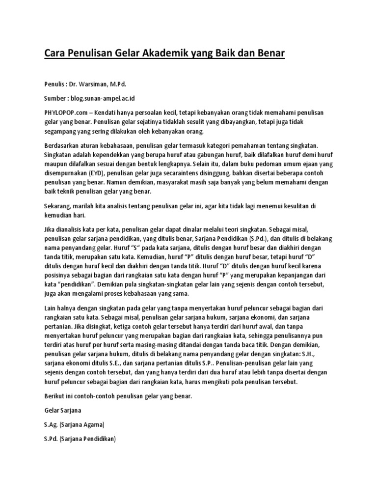 Contoh penulisan gelar yang benar. Singkatan sendiri adalah kependekan yang berbentuk huruf atau beberapa huruf yang dilafalkan huruf untuk huruf atau juga dilafalkan sesuai bentuk komplitnya. Penulisan yang benar adalah setelah nama penyandang gelar dibubuhkan tanda koma kemudian diikuti gelar yang pertama ditulis dengan teknik penulisan yang benar lalu dibubuhkan tanda koma untuk penulisan gelar yang kedua dan seterusnya jika ada gelar gelar yang lain. Gelar akademik pengertian jenis daftar nama profesi untuk pembahasan kali ini kami akan mengulas mengenai aransemen yang dimana dalam hal ini meliputi pengertian jenis bentuk langkah dan penulisan nah agar dapat lebih memahami dan dimengerti simak ulasan selengkapnya dibawah ini. Pada saat ini menulis gelar baik itu sarjana master maupun professor menunjukkan tingkat pendidikan seseorang yang. Cara penulisan gelar dalam penulisan gelar masih sama satu kelompok dengan pemahaman dalam penulisan singkatan. Perhatikan beberapa contoh penulisan gelar ganda di bawah ini.