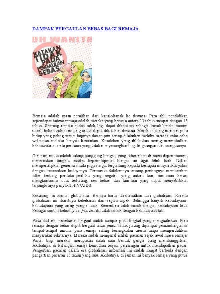 Sedangkan kata bebas berarti terlepas dari kewajibannorma agamatuntunan aturan dan pancasil hukum negara. Pengertian pergaulan bebas penyebab akibat cara mengatasisecara umum pengertian pergaulan bebas adalah salah bentuk perilaku menyimpang yang melewati batas dari kewajiban tuntutan aturan syarat dan perasaan malu. Walaupun tidak sesuai dengan norma dan ajaran di indonesia pergaulan bebas zaman sekarang sudah mulai seperti gaya hidup remaja pada umumnya. Pergaulan bebas sekarang sudah menjadi trend baru bagi anak muda zaman sekarangmereka melakukan perbuatan yang menyimpang dari nilai nilai budaya serta agama. Pengertian pergaulan bebas ialah sebuah arti yang diambil dari kata pergaulan dan bebas. Pergaulan bebas adalah salah satu kebutuhan hidup dari makhluk manusia sebab manusia adalah makhluk sosial yang dalam kesehariannya membutuhkan orang lain dan hubungan antar manusia dibina melalui suatu pergaulan interpersonal relationshippergaulan juga adalah ham setiap individu dan itu harus dibebaskan sehingga setiap manusia tidak boleh dibatasi dalam pergaulan apalagi dengan.