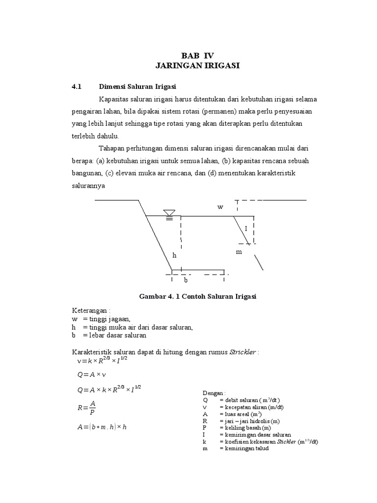 Contoh perhitungan saluran irigasi. 9 perencanaan saluran tahan erosi untuk penampang persegi empat penampang trapesium dan penampang setengah lingkaran dengan menggunakan metode kecepatan minimum yang diijinkan. 1 analisa hidrologi dalam analisa hidrologi ini urutan yang harus dilaksanakan adalah melakukan persiapan survey pengumpulan data primer dan sekunder pemilihan dan penyusunan data yang digunakan melakukan analisa debit rencana uji atas analisa yang telah dilakukan penentuan debit. Merencanakan saluran terbuka untuk jjgaringan irigasi dan jaringan drainase. Perhitungan air irigasi dan dimensi saluran. Lebar tanggul saluran irigasi dibuat sedemikian rupa sehingga dapat dilalui orang. Tampak pada screenshot dibawah ini.