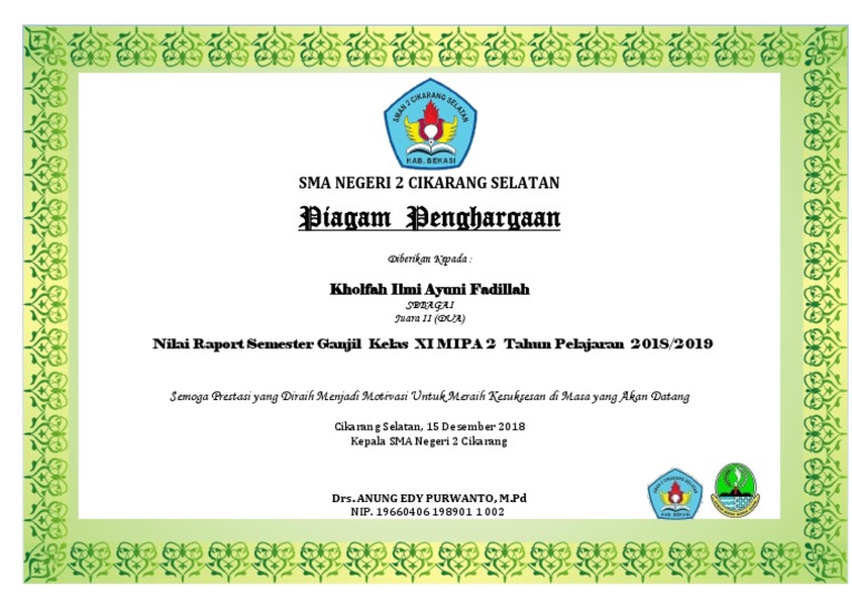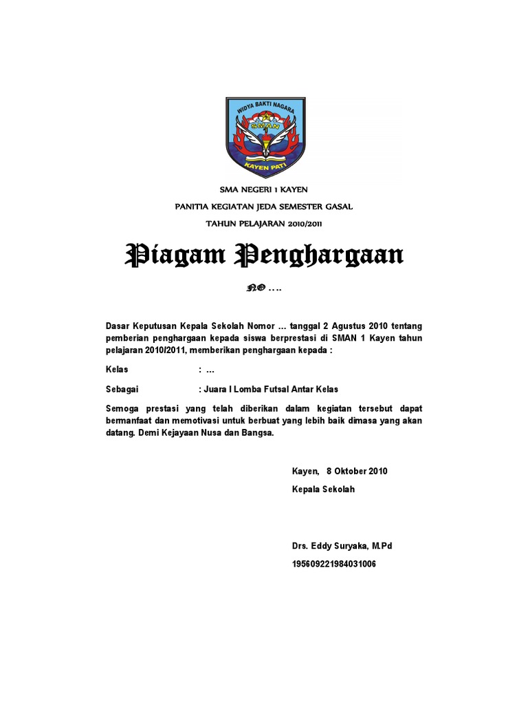 Master template piagam penghargaan juara lomba kelas piagam penghargaan adalah salah satu bukti yang diberikan kepada pemenang peserta lomba juara kelas ataupun suatu kegiatan lainnya atas ketercapaian sebuah prestasi yang sangat membanggakan di dalam suatu perlombaan atau sejenis persaingan. Format ini berbasiskan microsoft word yang diintegrasikan dengan microsoft excel melalui fungsi mail merge.