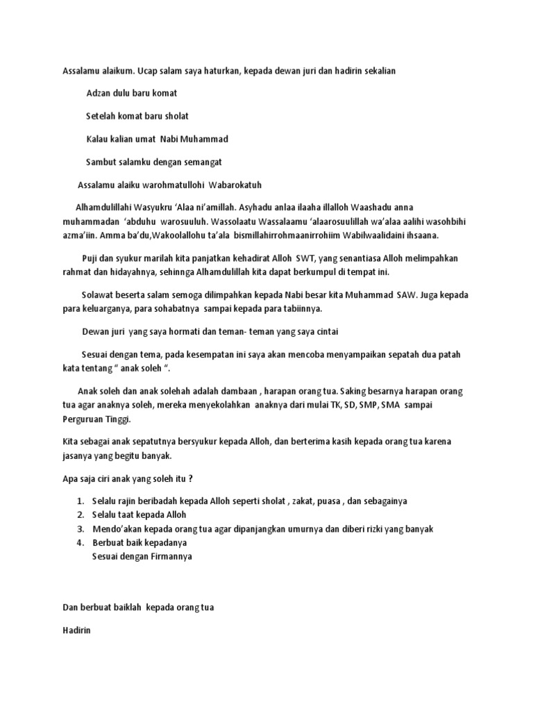 Tiada kata yang paling indah kecuali syukur kita kepada allah yang maha pengasih yang kasih nya tidak pernah pilih kasih. File berformat microsoft word documents docrtf silahkan download secara gratis dan kembangkan kembali agar lebih sempurna. Ok sholat dan ngaji itu 2 contoh cirri anak yang sholehsholat 5 kali dalam sehari subuhdhuhurasharmagribdan isyak dalam surat an naim ayat 62 fasjuduu lillaahi wabuduuartinya maka bersujudlah sholat. Pidato tentang anak sholeh dan sholeha teks pildacil lucu pidato anak soleh harapan ibu bapa teks pildacil tentang sholat contoh naskah pidato islam untuk anak teks ceramah anak singkat teks pildacil tentang menuntut ilmu teks pidato anak mensyukuri nikmat allah. Pidato tentang anak yang sholeh السلام عليكم ورحمةالله وبركاته الحمدلله والصلاةوالسلام على رسول ا لله و على اله و صحبه ومن ولاه. Kesimpulan pidato saya ialah adab menghormati orang tua adalah salah satu adab yang baik kepada orang tua.