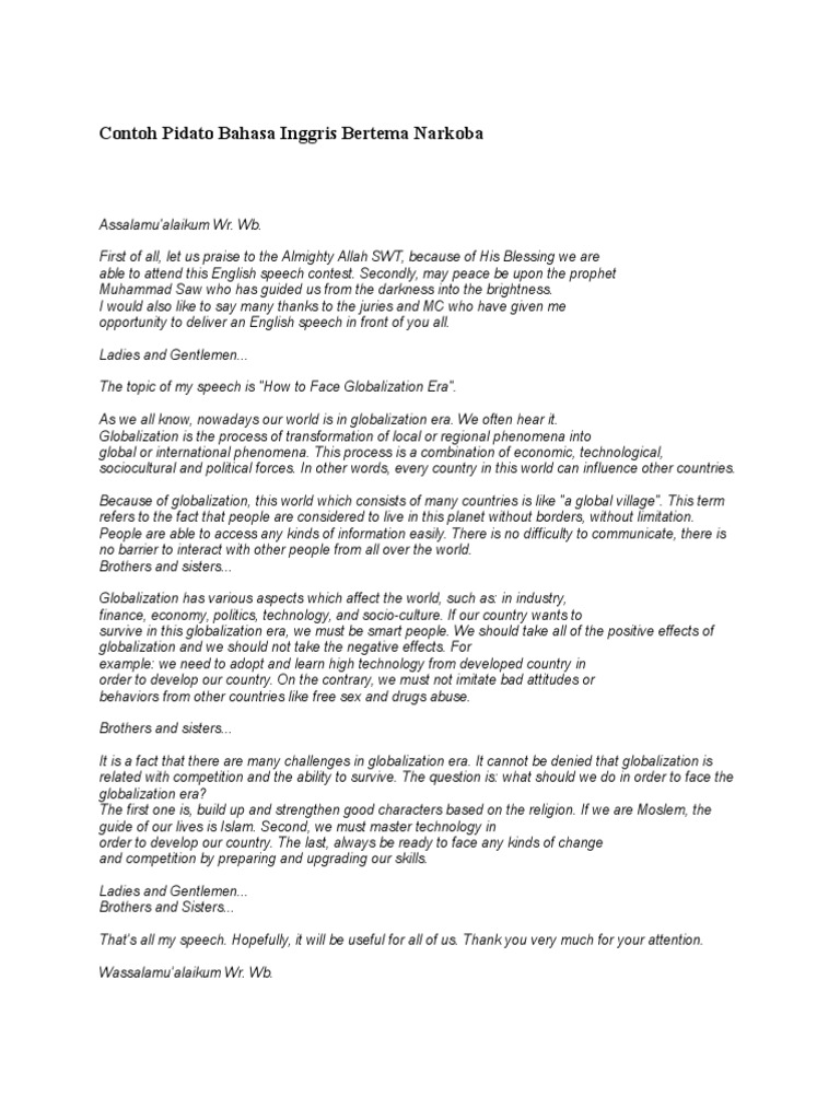 Pidato biasanya memiliki fungsi untuk memberikan informasi ataupun mempengaruhi pendengar akan suatu sudut pandang tertentu pidato juga memiliki. Kita masuk dulu ke contoh pidato singkat tentang narkoba yah sekitar 5 menitan selesai jika kalian berpidato dengan kecepatan bicara yang pas. Demikian contoh pidato tentang bahaya narkoba dalam bahasa inggris dan artinya semoga bisa memberikan inspirasi kita semua untuk tetap hidup normal layaknya manusia tanpa terpengaruh dengan hiruk pikuk gaya anak muda yang tak mengerti nasib masa depannya. Entah dalam rangka tugas sekolah maupun sebagai pembelajaran pribadi. Text 1 assalamualakum wr wb best wishes. Pidato merupakan sebuah kegiatan berbicara di depan umum untuk menyampaikan apa yang dimaksudkan didepan penonton.