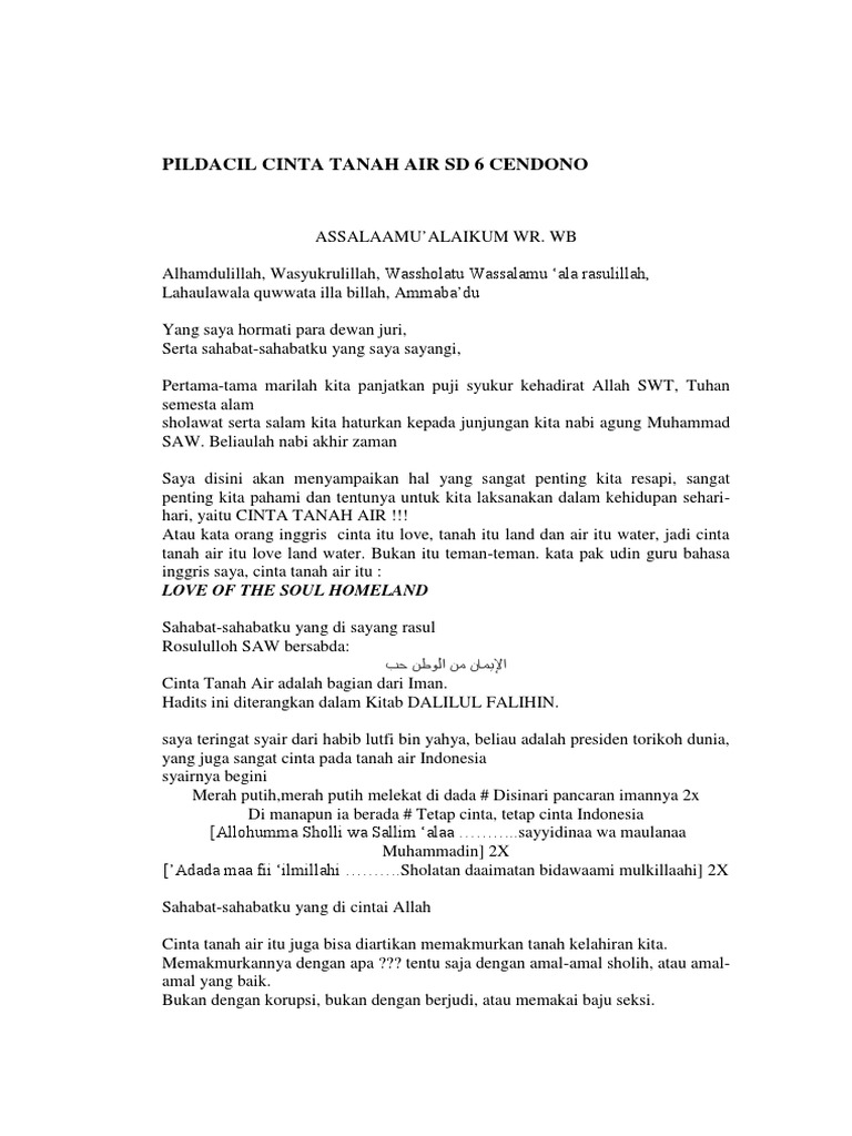 Doc pidato cinta tanah air mnr rafi academiaedu. Jika tidak diberi pidato cinta tanah air yang sesuai maka mereka akan mudah terpengaruh paham radikalisme atau kebarat baratan. Hal itu bisa kita lakukan dengan menaati setiap peraturan yang berlaku. Yang saya hormati kepala sekolah dan jajarannya staf pengajar dan tata usaha sma negeri 6 kota serang. Demikianlah contoh pidato bahasa inggris tentang cinta tanah air beserta artinya contoh ini juga sangat cocok untuk tema pidato mengenai nasionalisme semoga bermanfaat untuk semuanya. Assalamualaikum warahmatullaahi wa barakaatuh.