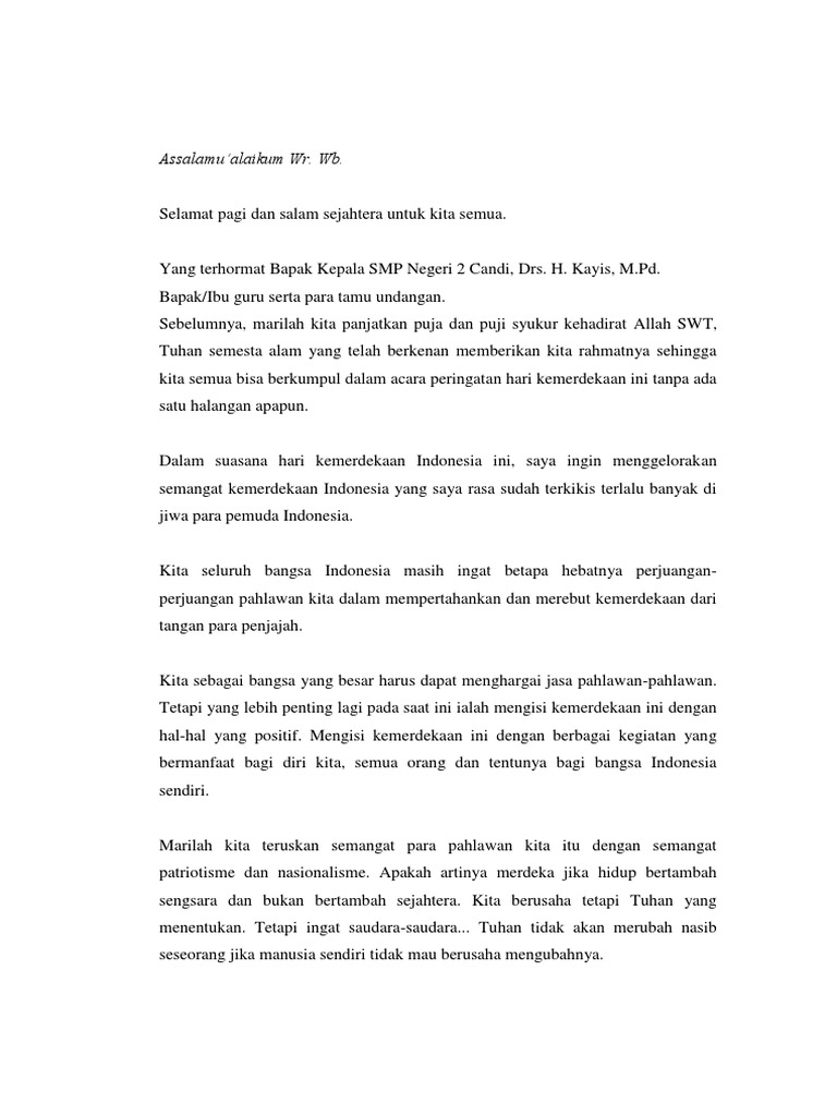 Naskah pidato lomba kemerdekaan smada oleh anastasia evira. Pidato kemerdekaan pidato kemerdekaan adalah pidato yang biasanya disampaikan pada saat tertentu yaitu hari kemerdekaan indonesia. Dear ladies and gentleman. Soekarno didampingi drs. Contoh pidato hari kemerdekaan singkat akan anda cari saat diminta memberikan sambutan di acara peringatan hari hut ri itu. Hari kamis tanggal 7 mei 2009 jam 2.