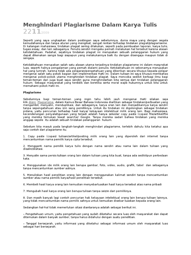 Contoh plagiarisme dalam karya ilmiah. Pelaku yang melakukan plagiarisme memiliki beberapa alasan kenapa mereka melakukan tindakan tidak terpuji tersebut. 24 sistematika penulisan karya ilmiah. Plagiarisme tidak disengaja dapat pula terjadi. Ada dua macam tindakan plagiat yang dijumpai dalam karya tulis ilmiah yaitu plagiarisme tidak sengaja inadvertent plagiarism dan plagiarisme yang disengaja deliberate plagiarismplagiarisme tidak disengaja adalah plagiarisme yang terjadi karena ketidaktahuan ignorancy penulis terhadap perkembangan ilmu yang menjadi bidang spesialisasinya. Contoh karya ilmiah bab i pendahuluan. Plagiat merupakan tindakan criminal besar dalam penulisan sebuah karya yang sifatnya dapat membunuh karya kreatifitas hak cipta dan seterusnya akan membunuh perkembangan ilmu dalam bidang yang terkait.