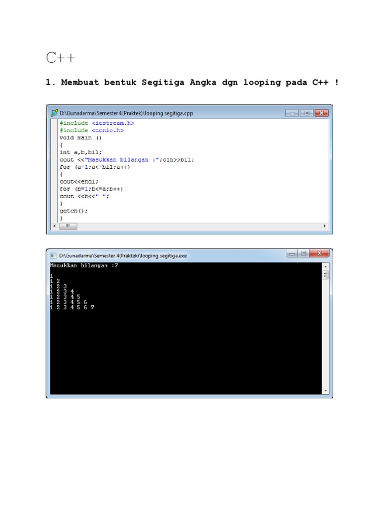 Namun jika angka yang anda masukan bukan 1 2 dan 3 maka program akan menuju identifier ulangi. Looping for dan nested for. Kita membuat blok program di antara tanda kurung kurawal dan sebagai penanda bahwa bagian di dalam kurung kurawal inilah yang akan dikenai proses perulangan. Pada kesempatan kali ini saya akan menjelaskan tentang bagaimana cara membuat output angka berurutan berbentuk segitiga dengan bahasa c menggunakan borland chasil outputnya si simpel cuma angka angka berurutan yang membentuk segitiga tapi algoritmnya itu loh yang susah bisa bisa rambut sampai kriting gara gara algoritma d. Seperti yang kita tahu jika kita sebelumnya sudah mengenal atau mempelari tentang looping perulangan dan nested loops perulangan bersarang kita dapat membuat suatu pola yang dapat digambarkan atau ditampilkan dalam bentuk segitiga. Yaitu menampilkan deret bilangan segitiga untuk membuat tugas yang sangat diburu silahkan anda lihat langsung pada scriptnya.