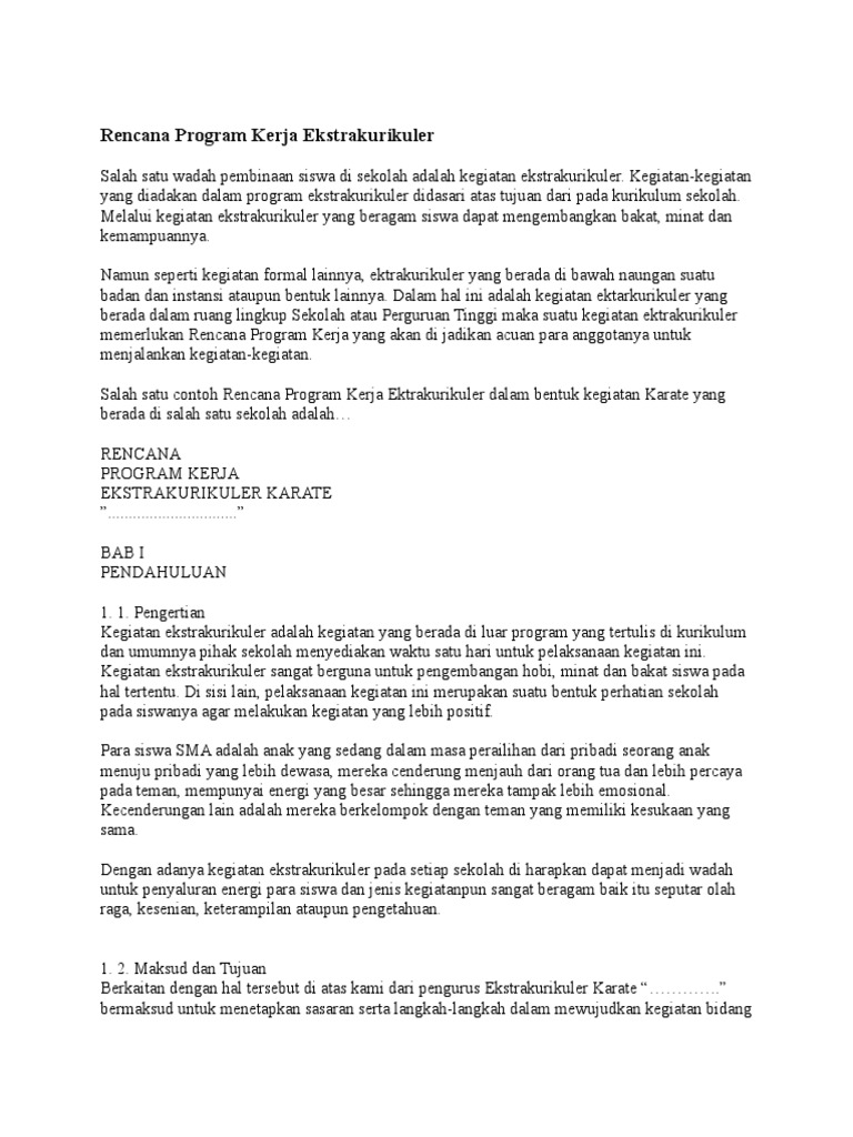 Ekstrakurikuler merupakan kegiatan pembelajaran di luar jam pelajaran formal yang dilakukan oleh peserta didik diseluruh jenjang pendidikan mulai dari tingkat satuan pendidikan sekolah dasar sampai dengan universitas atau perguruan tinggi umumnya di luar jam belajar kurikulum standar. Dari format contoh yang kami bagikan disini dibuat dengan menggunakan file berupa microsoft word sehingga memudahkan bapak ibu guru dalam melakukan pengeditan sesuai dengan kebutuhan serta program esktrakurikuler yang akan diselenggarakan dari kegiatan kerja ekstrakurikuler bulu tangkis tersebut pun memiliki penyusunan. Demikianlah gambaran rencana program kerja ini kami susun dengan harapan akan menjadi acuan dalam melaksanakan langkah langkah kegiatan ekstrakurikuler karate sehingga perkembangan kegiatan ini akan lebih jelas dan terarah dalam pencapaian tujuan dengan di sertai bantuan oleh pihak pihak yang terkait baik secara langsung maupun tidak langsung semoga rencana kegiatan ini akan dapat terlaksana. Tercapainya program kerja olahraga tahun pelajaran 20172018 di smpn 2 sukagumiwang kabupaten indramayu.
