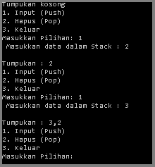 Pengertian stack pada struktur data adalah sebagai tumpukan dari benda sekumpulan data yang seolah olah diletakkan di atas data yang lain koleksi dari objek objek homogen atau suatu urutan elemen yang elemennya dapat diambil dan ditambah hanya pada posisi akhir top saja. Strutur data ini kolomnya berubah ubah secara dinamis. Contoh program stack pada c stack adalah sebuah kumpulan data dimana data yang diletakkan di atas data yang lain. Fungsi ini untuk menampilkan hasil stacknya jika top 1 yang artinya data stack tidak adanilai semula dari variabel top maka disitu tampilkan empty jika tidak kosong langsung diproses dan menampilkan data array stack dengan for data akan muncul satu persatu sesuai data yang kita masukan. Contoh struktur data dapat dilihat dalam spreadsheet database pengolah kata gambar terkompresi dan mengompresi file dengan teknik tertentu yang memanfaatkan struktur data. Stack bisa diartikan sebagai suatu kumpulan data yang seolah olah ada data yang diletakkan di atas data yang lain.