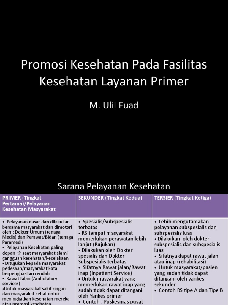 Paradigma sakit merupakan upaya untuk membuat orang sakit menjadi sehat menekankan pada kuratif dan rehabilitatif sedangkan paradigma sehat merupakan upaya membuat orang sehat tetap sehat menekan pada. Pada promosi kesehatan pendidik akan mengajarkan peserta didik untuk mengingatmenerima dan memahami materi kesehatan yang akan diberikan. Penyuluhan pemberdayaan masyarakat pelatihan dan advokasi. Rekam medis dapat dipakai untuk mengidentifikasi data yang diperlukan guna seleksi dan promosi jasa pelayanan kesehatan. Kesehatan masyarakat merupakan upaya untuk mencegah penyakit memperpanjang hidup dan meningkatkan kesehatan. Promosi kesehatan merupakan upaya untuk meningkatkan kemampuan masyarakat melalui proses pembelajaran dari oleh untuk dan bersama masyarakat agar mereka dapat menolong dirinya sendiri serta mengembangkan kegiatan yang bersumber daya masyarakat sesuai dengan kondisi social budaya setempat dan didukung oleh kebijakan publik yang berwawasan kesehatan.