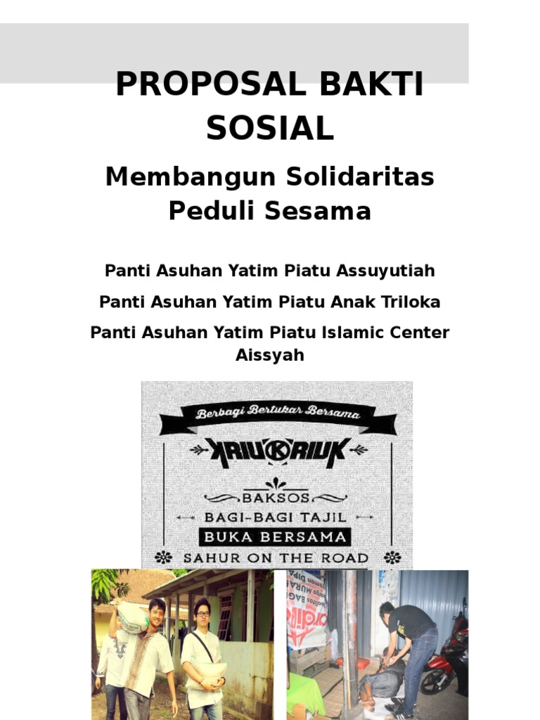Bakti sosial ini merupakan suatu bentuk bantuan yang walaupun kecil namun sangat berguna untuk membantu beban panti asuhan al hayat serta berbagi kebahagian bersama anak anak yatim piatu. Kegiatan ini menjelma menjadi sebuah jembatan antara kepedulian kami dan masyarakat terhadap mereka yang membutuhkan terutama pada panti asuhan. Atas limpahan rahmat taufik hidayah serta inayah nya kami dapat menyelesaikan laporan hasil kunjungan kami ke panti asuhan yatim piatu dan dhuafa mustika tama yang bertempat di padokan kidul tirtonirmolo kasihan bantul yogyakarta pada sabtu 21 desember 2013 pukul 1000 1230 wib. Panduan membuat dan contoh proposal 17 agustus. Proposal ini merupakan bagian dari aksi nyata kami dalam membangun jalinan kasih antar sesama. Kami menyadari sepenuhnya bahwa didalam makalah ini terdapat kekurangan serta jauh dari kata kesempurnaan.