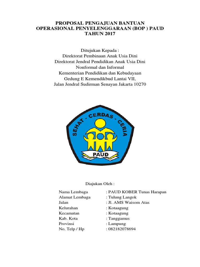 Contoh proposal bop paud 2018. Setiap akan dicairkannya dana bop paud maka semua lembaga yang telah tercantum dalam aplikasi dapodik paud berhak mendapatkan dana tersebut dengan menghitung jumlah peserta didik dikali enam ratus ribu rupiah dalam setiap tahunnya. Contoh proposal bop paud tahun 20172018 ini merupakan file terbaru yang akan saya bagikan dalam kesempatan kali ini khususnya untuk sps yang baru yang belum dibiayai oleh dana bop bantuan operasional paud. Contoh proposal usulan dana bop paud tahun 2018 ini sesuai dengan juknis bop terbaru 2018 silahkan lihat disini. Contoh proposal bop paud 2018 pengajuan bantuan operasional paud ini merupakan file terbaru yang akan saya bagikan dalam postingan saya kali ini khsuusnya untuk lembaga pendidikan anak usia dini paud baik jenis jenjang tk maupun kober yang belum menerima dana operasional dari pemerintah. Format terbaru proposal pencairan dana bop paud tahun 2018. Identitas satuan program layanan data administrasi data anak.