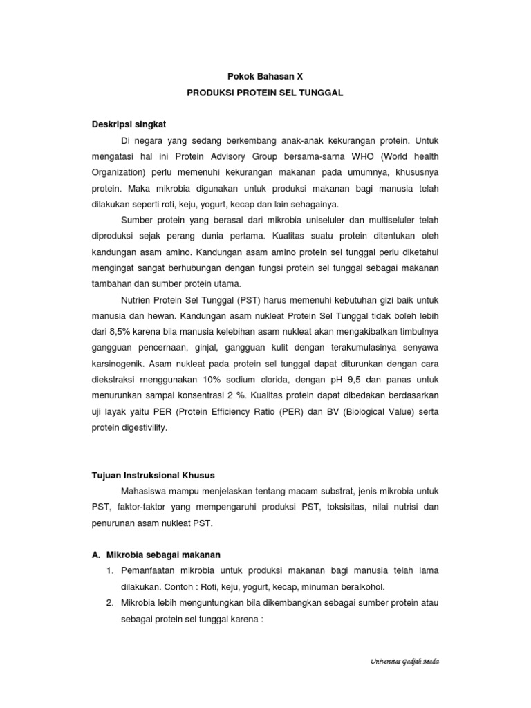 Protein sel tunggal jurnal. Protein sel tunggal merupakan produk pengembangan bahan makanan berkadar protein tinggi yang berasal dari mikroba melalui mekanisme biteknologi. Istilah protein sel tunggal pst digunakan untuk membedakan bahwa protein sel tunggal berasal dari mikro organisme bersel tunggal atau banyak contohnya seperti bakteri atau alga. Pada adonan biasa atau adonan yang disuplai bahan nutrisi yang tidak perlu steril sumber energinya dipakai karbohidrat. Istilah protein sel tunggal pst digunakan untuk membedakan bahwa pst berasal dari organisme bersel tunggal atau banyak. Protein sel tunggal single cell protein scp adalah makanan berkadar protein tinggi berasal dari mikroorganisme contoh.