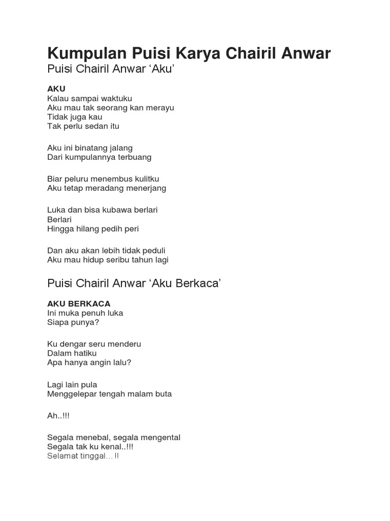 Kumpulan puisi chairil anwar nama chairil anwar abadi bersama puisi puisi nya yang tak lekang oleh waktu hingga saat ini. Karya karyanya banyak dikutip dan dipentaskan ulang oleh para seniman lain hingga sekarang. Aku karya chairil anwar. Home aku karya chairil anwar. Chairil anwar memiliki nama julukan yaitu si binatang jalang. Salah seorang penyair terbaik milik indonesia di zamannya.