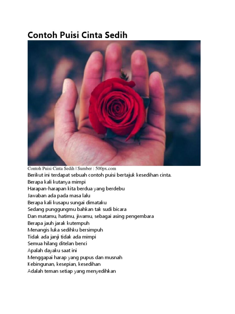 Contoh puisi tentang cinta. Namun tidak semua orang pandai dalam merangkai kata kata indah untuk dijadikan sebuah puisi. 92 puisi sedih ini bikin nangis benar2 memilukan. Simak berbagai contoh puisi pendek tantang berbagai topik seperti kehidupan cinta lingkungan alam persahabatan dalam bahasa indonesia dan bahasa inggris yang dikumpulkan dari berbagai sumber berikut ini. Dalam sekejap kamu akan jadi pujangga yang benar benar mahir membuat puisi. Puisi sedih adalah kumpulan puisi pendek tentang kesedihan karena cinta sedih untuk orang orang tercinta sebagai contoh puisi sedih untuk ibu yang mana kesedihannya tak berkesudahan dan banyak yang malah mendatangkan penyakit rohani akan tetapi rasa sedih yang mampu disalurkan dengan baik akan menjadi model terapi masa kini yang cukup. Puisi romantis kumpulan puisi romantis pasti menjadi incaran anda yang tengah ingin memberikannya kepada pasangan.