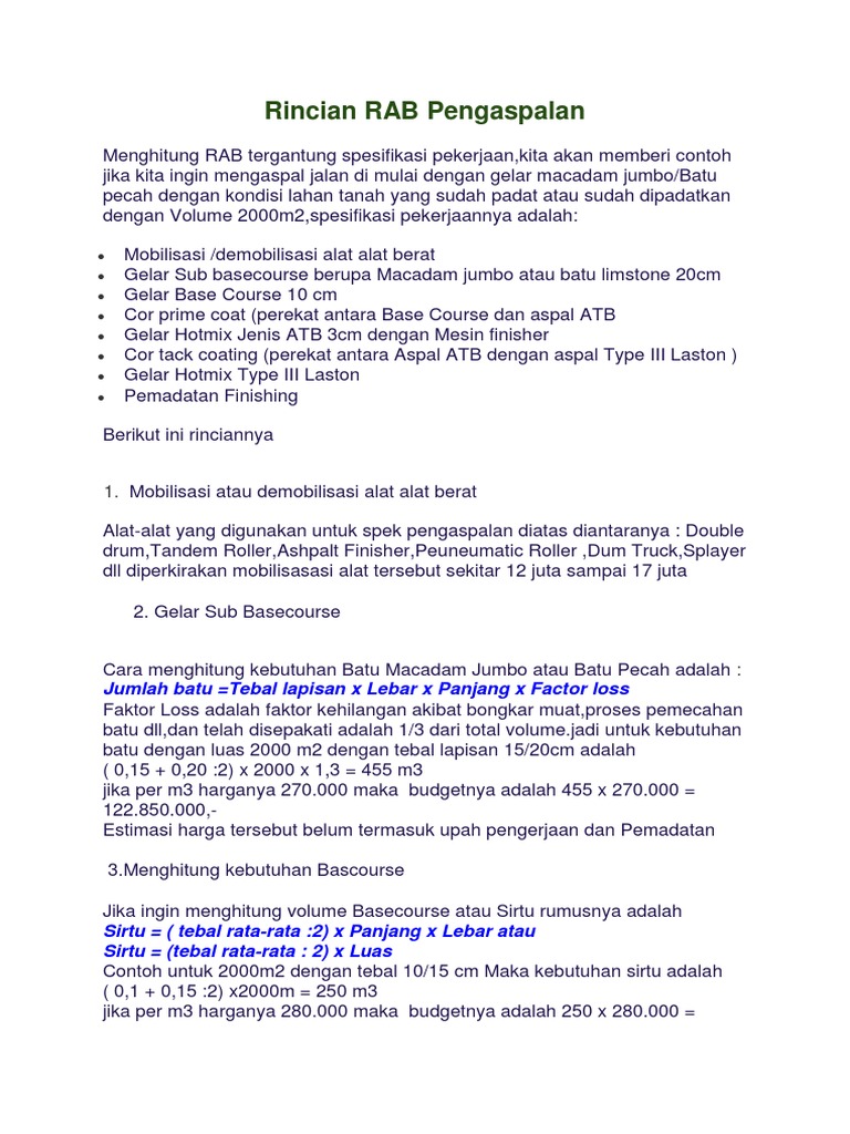 Kebutuhan hotmix dg ukuran 1000 m2tbl 3 cm 1000 x 003 x 23 69 ton. Contoh rab rencana anggaran biaya desa perumahan pekerjaan pengaspalan jalan maupun perbaikan jalan berikut ini adalah contoh proposal pengaspalan jalan terbaru proposal jasa perbaikan aspal jalan yang dapat anda jadikan acuan dalam menyusun proposal semoga dapat bermanfaat. 1 m3 base course harganya 25000000 maka upah pengerjaannya adalah. Rumus menghitung keperluan aspal hotmix luas x tebal x bulk density. 69 x 1100000 75900000. Biaya upah buruh dan keuntungan jasa.