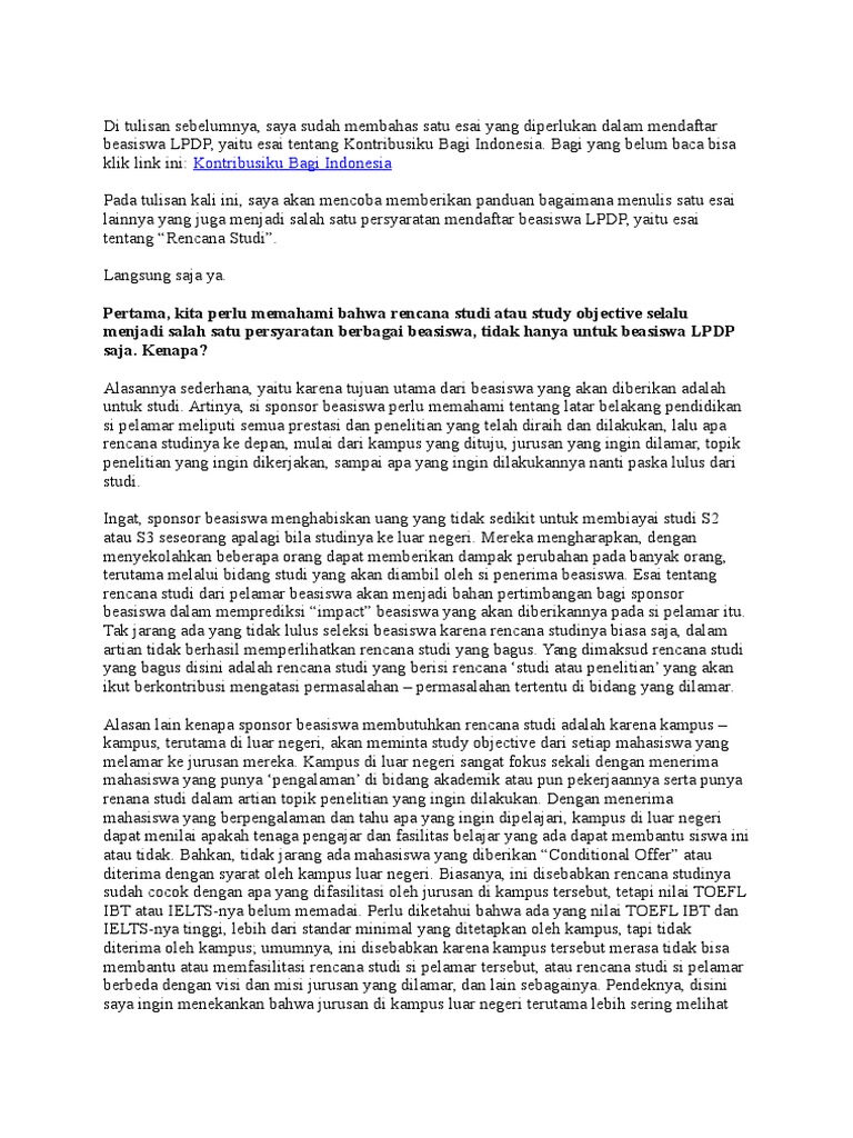Saat memulai studi phd di fall semester 2014 bulan agustus desember saya semangat sekali mempelajari berbagai hal terkait dengan studi terutama tentang menulis satu research grant dana penelitian. Pertama rencana studi yang kalian buat jangan lebih dari 700 kata sepertinya peraturan lpdp 2018 sudah berubah silahkan dibaca. Pada beasiswa lpdp 2019 ini ada dua essay yang harus ditulis oleh pejuang beasiswa yaitu proposal studi dan rencana studi. Calon penerima beasiswa magister. Beberapa dari teman teman ada yang menanyakan contoh rencana studi lpdp yang saya tuliskan dan saya totally cc by saya berkeyakinan bahwa semua ilmu pengetahuan perlu disebarluaskan agar bisa. Melihat beasiswa lpdp 2018 ada dua essay yang harus ditulis oleh pejuang beasiswa yaitu stement of purpose dan rencana studi.