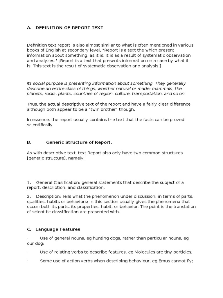 Karena sering disamakan dengan descriptive text maka report text harus dicirikan dengan ciri khususnya. It is as a result of systematic observation and analyses report adalah sebuah teks yang menghadirkan informasi tentang suatu hal secara apa adanya.
