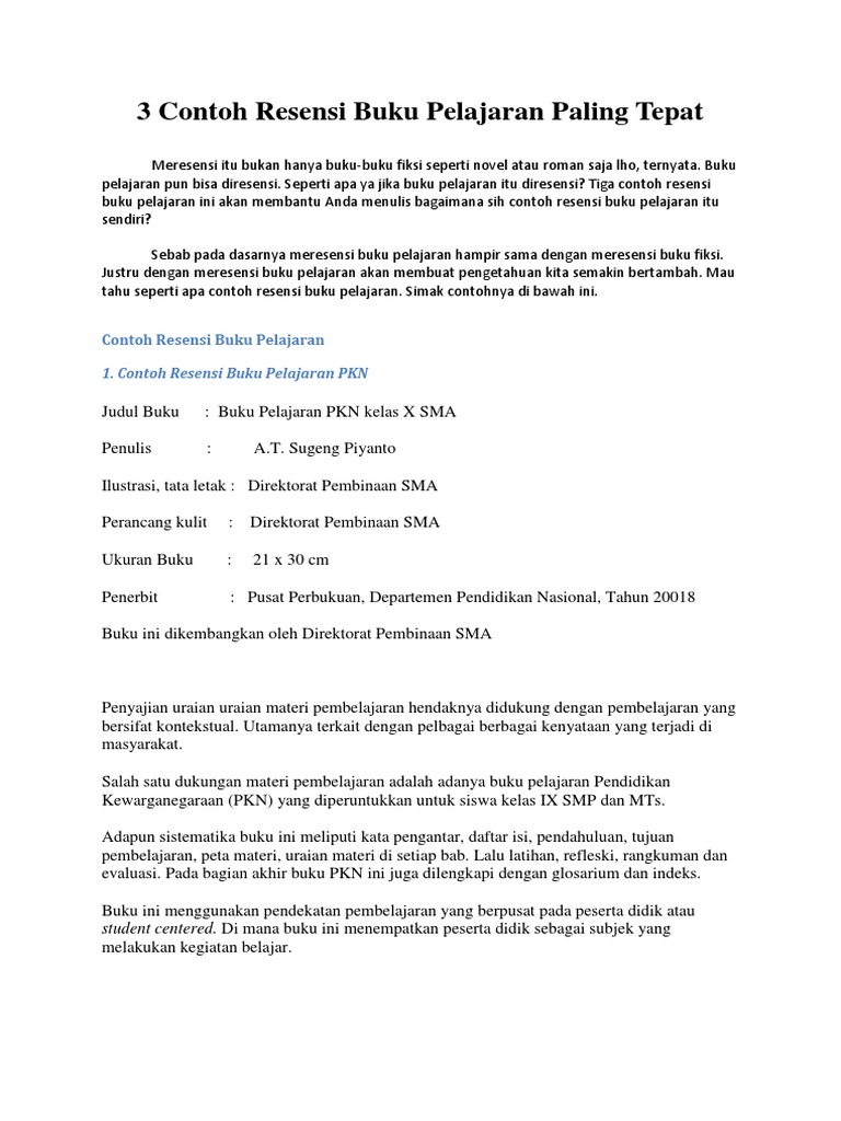 Bahasa indonesia untuk smpmts kelas ix. Apakah teman teman pernah mendengar kata resensi. Untuk artikel kali ini kita akan mengetahui seerti apa contoh resensi untuk sebuah buku pelajaran resensi merupakan suatu ulasan tentang buku baik itu buku non fiksi fiksi maupun buku pelajaran. Di artikel sebelumnya kita telah mengetahui seperti apa contoh resensi non fiksi. Contoh resensi buku apakah anda pernah mendengar kata resensi memang benar jika kata resensi adalah kata yang sangat serig kita dengar namun banyak juga orang yang belum paham apa itu resensi sehingga banyak yang kebingungan jika harus melakukan resensi buku. Berikut contoh resensi buku pelajaran.