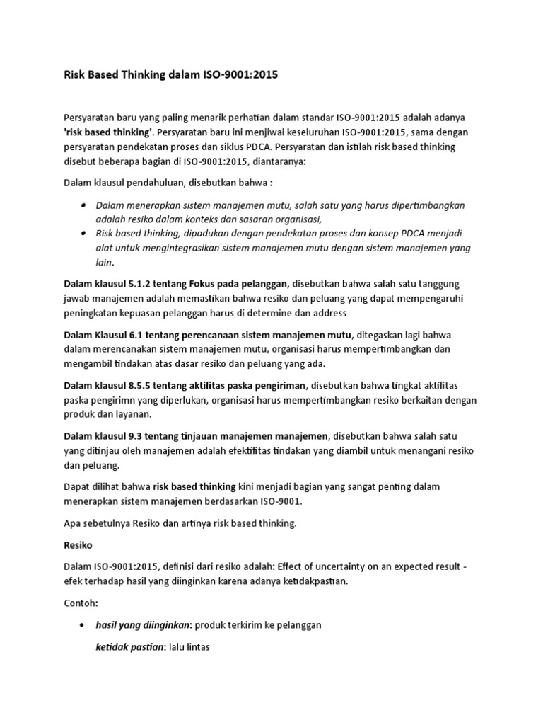 Contoh resiko dan peluang iso 9001 2015. Seluruh proses bisnis dan klausul iso 9001terkait auditan keandalan pengendalian intern tingkat entitas melalui verifikasi data dukung pm epite. Diimplementasikan iso 90012015 per tanggal 30 mei 2017. Multiple training consulting adalah konsultan iso 9001 iso 14001 dan iso 45001 yang siap membantu perusahaan anda dalam meraih sertifikat iso 90012015 iso 140012015 dan iso 450012018 dengan harga kompetitif dan kualitas terjamin. Selamat datang di situs konsultan iso 9001 iso 14001 dan ohsas 18001. Elemen risiko dan peluang secara efektif menggantikan proses tindakan pencegahan yang lama jadi apa yang perlu. Bila dikaitkan dengan pembagian jenis resiko diatas maka penyandingan resiko dan peluang dalam iso 90012015 dapat diartikan bahwa organisasi perlumengidentifikasi adanya peluang.
