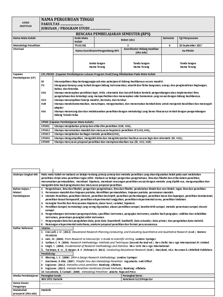 Contoh format rps catatan. Bahasa indonesia mata kuliah pengembangan kepribadian di perguruan tinggi jakarta. 16 ujian akhir semester 30 penetapan nilai akhir. Secara garis besar kurikulum sebagai sebuah rancangan. Pdf on mar 28 2017 ismail ismail published rencana pembelajaran semester rps sap dan kontrak dengan sistem penilaian otentik dilengkapi dengan format dan rubrik penilaian find read and. Uu no 12 thn 2012 tentang pendidikan tinggi.