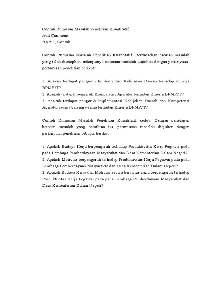 Contoh rumusan masalah penelitian. Contoh rumusan masalah dalam membuat suatu makalah baik itu makalah penelitian maupun skripsi pasti di dalamnya ada bagian yang tidak boleh dihilangkan yaitu perumusan masalah. Berbeda dari latar belakang yang memaparkan secara ringkas topik yang hendak dibahas rumusan masalah sebagai peramu dan pembatas masalah apa yang hendak dibahas. Sebuah masalah yang dirumuskan dengan baik akan menghasilkan output yang baik pula. Narasi pertanyaan penelitian pada bagian rumusan masalah bisa ditulis seperti contoh diatas. Dua contoh awal ditulis menggunakan poin. Contoh rumusan masalah penelitian penelitian dapat kita definisikan sebagai suatu kegiatan penyelidikan yang dilakukan secara aktif tekun dan sistematis dengan tujuan untuk menemukan menginterpretasikan dan merevisi fakta fakta yang ada di lapangan dengan mengacu pada teori teori yang sudah ada.
