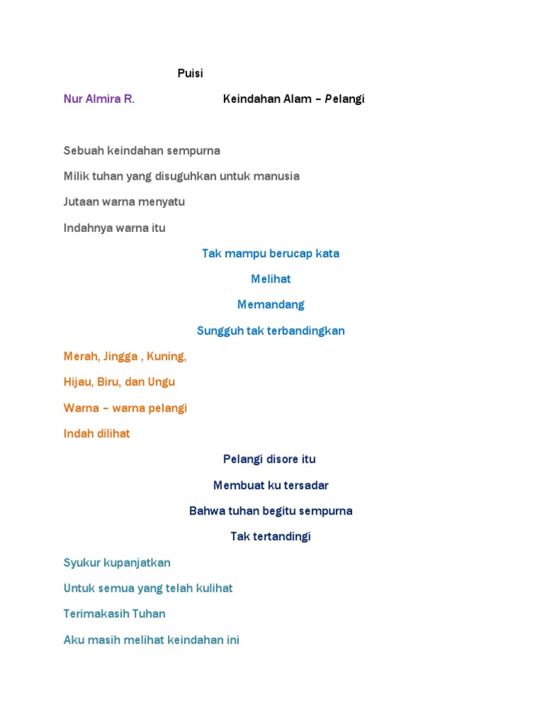 Mudah mudahan dapat bermanfaat baik itu untuk sekedar bahan referensi ataupun tugas bahasa sunda di sekolah kamu. Sesuai dengan sebutannya cerpen adalah salah satu jenis jenis prosa baruberbeda dari jenis jenis prosa lain seperti roman hikayat dan novel cerpen ditulis dengan kurang dari 10000 kata. Kumpulan contoh puisi bertema keindahan alam dan lingkungan hidup alam dan lingkungan ini merupakan tempat bagi kita semua makhluk hidup di muka bumi baik itu manusia hewan tumbuhan atau benda mati lainnya. Berikut ini merupakan puisi alam baik tentang ketakjubannya maupun kengeriannya. Untuk sementara mungkin hanya itu dan nanti akan saya tambahan lagi puisi bahasa sunda tentang kaendahan alam nya. Masing masing dari 10 puisi keindahan alam dibawah ini merupakan hasil curahan dan ekspresi warga indonesia yang ingin menggambarkan pesona keindahan alam di negeri tercinta ini.