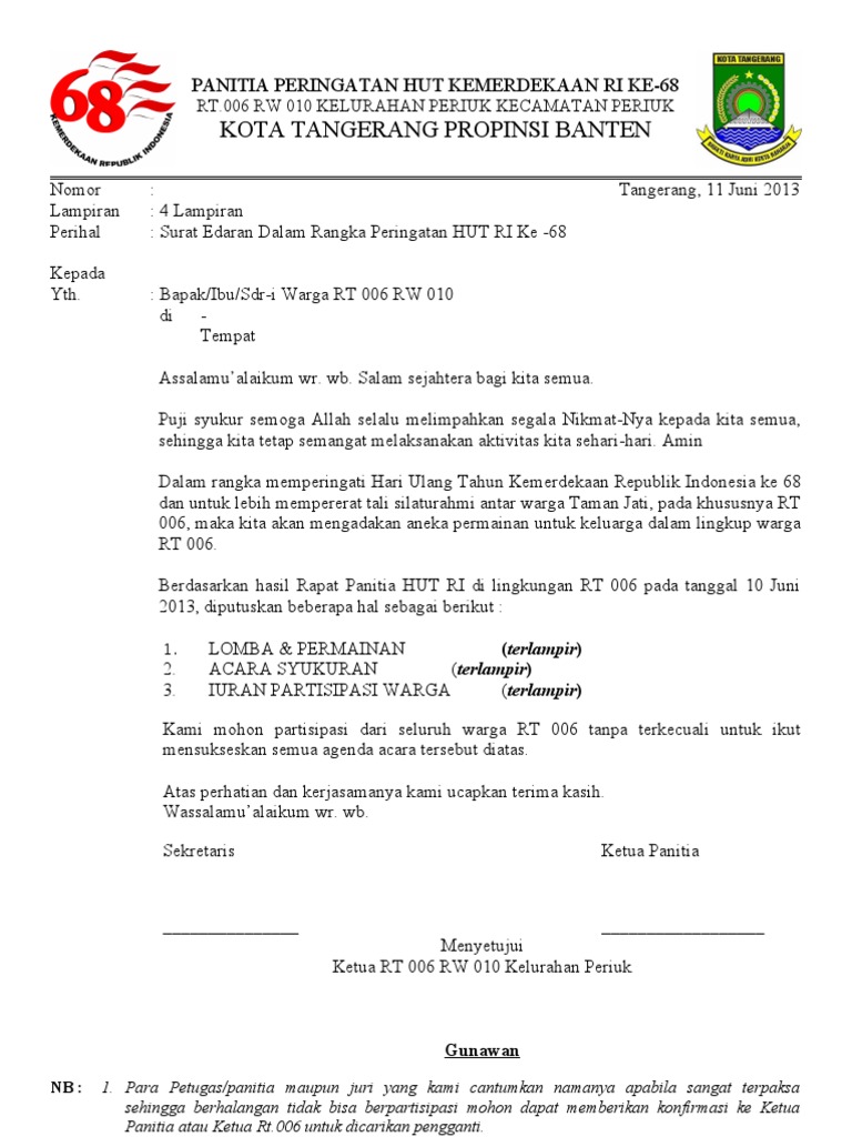 Yang terhormat ibu ketua rt 30 kampung terban. Kelengkapan panitia 17 agustus akan sangat berguna dalam kelangsungan kegiatan menyambut hut ri 74.