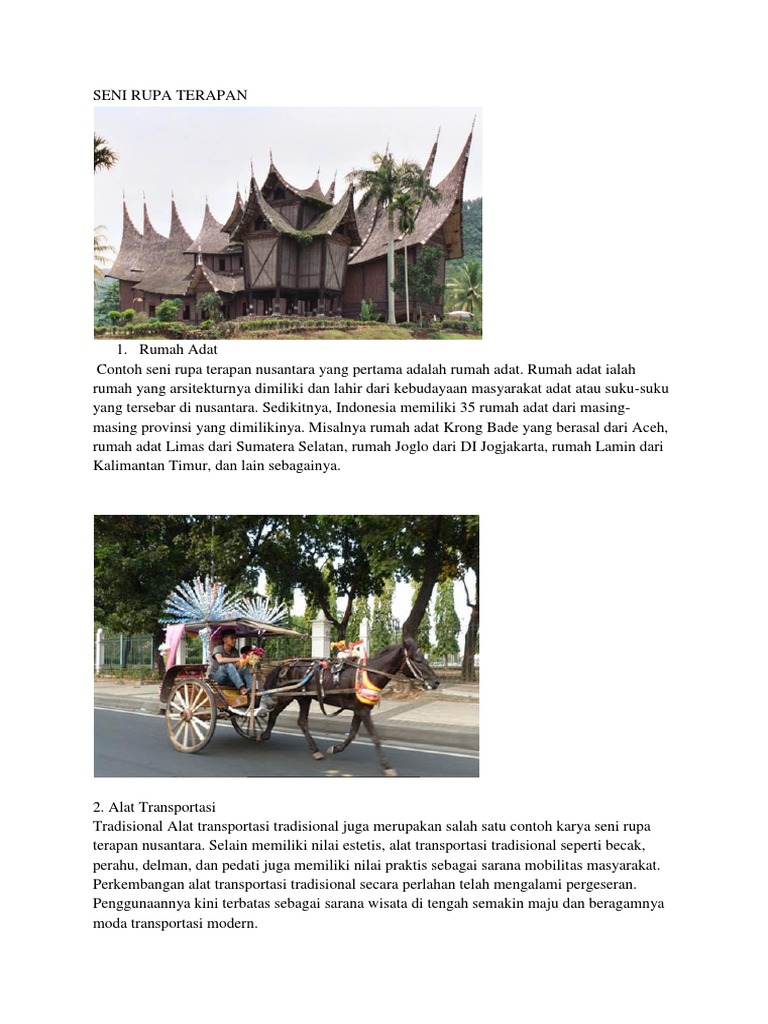 Contoh seni rupa terapan nusantara. Contoh seni rupa terapan nusantara yang pertama adalah rumah adat. Setiap daerah memiliki ciri khas kebudayaannya. Sebagai media komunikasi maka didalam seni grafis terapan ada pengirim berita atau pesan ada isi pesan atau berita dan ada penerima berita. Sedikitnya indonesia memiliki 35 rumah adat dari masing masing provinsi yang dimilikinya. Media yang dipakai untuk mengirim berita tersebut bermacam macam. Pada masing masing daerah dan suku memiliki ciri khas tersendiri dalam membuat karya seni ini.