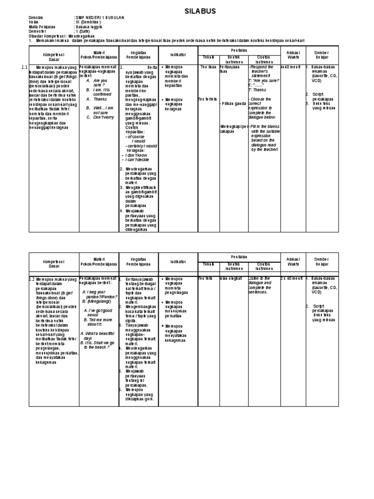 Contoh silabus bahasa inggris. Bertemu lagi dengan kami disini. Oleh admin diposting pada 31 agustus 2017 31 agustus 2017. Silabus bahasa inggris smp kelas 9 kurikulum 2013 rpp bahasa inggris smp kelas 7 kurikulum 2013 catatan rpp baru sebagai contoh saja silakan bapak dan ibu guru kembangkan sendiri dari silabus. Silabus adalah rencana pembelajaran pada suatu kelompok mata pelajarantema tertentu yang mencakup standar kompetensi kompetensi dasar materi pokokpembelajaran kegiatan pembelajaran indikator penilaian alokasi waktu dan sumberbahanalat belajar. Perubahan kurikulum 2013 tahun 2017 ini sangat penting untuk diketahui oleh semua guru sma terutama bagi guru yang sekolahnya melaksanakan kurikulum 2013. Memang untuk kurikulum baru 2013 ini ada sedikit perubahan untuk jenjang smk oleh karena nya kita diharapkan segera untuk dapat menyesuaikan diri.