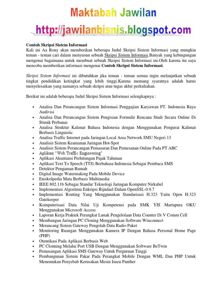 Contoh skripsi sistem informasi s1. Under graduates thesis universitas negeri semarang. Judul skripsi teknik informatika s1 pada kesempatan kali ini kami akan memberikan referensi dan list kumpulan judul judul skripsi yang bisa kalian coba ajukan. Skripsi sistem komputer pdf. Sebelumnya kami sudah memberikan referensi judul skripsi berbasis android beserta link jurnalnyanamun jika kalian masih bingung dengan berbasis android dan ingin membuat skripsi berbasis web berikut kami berikan 100 contoh skripsi sistem informasi berbasis web dan beserta tautan jurnal disadur darigoogle scholar yang bisa kamu pelajari sebagai bahan. Judul skripsi sistem informasi terbaru untuk kamu. Namun jangan lupa untuk mencocokkan dengan bidang yang anda kuasai.