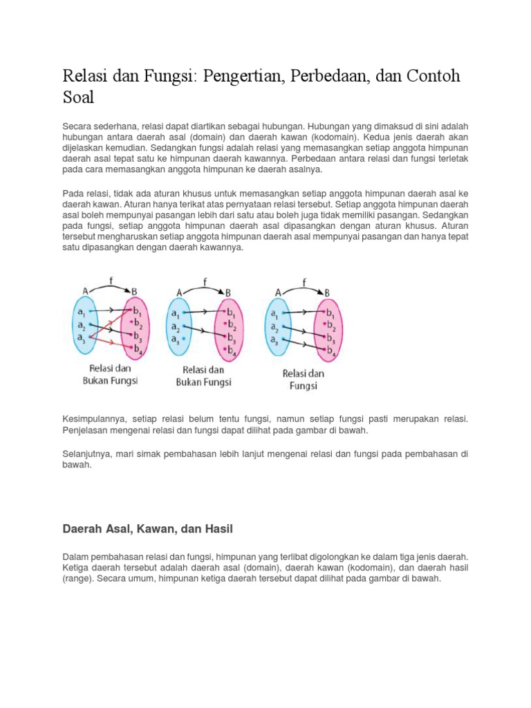 Berikut ini adalah contoh soal relasi dan fungsi untuk kamu pelajari persiapan ulangan harian dan melatih kemampuan kimia kamu yang berjumlah 22 butir soal. Himpunan a disebut domain. Istilah ini berbeda pengertiannya dengan kata yang sama yang dipakai sehari hari seperti alatnya berfungsi dengan baikkonsep fungsi adalah salah satu konsep dasar dari matematikadan setiap ilmu kuantitatif. Ketiga daerah tersebut adalah daerah asal domain daerah kawan kodomain dan daerah hasil range. Dalam pembahasan relasi dan fungsi himpunan yang terlibat digolongkan ke dalam tiga jenis daerah. Saat mengerjakan pecahan anda tidak pernah dapat membagi dengan nol.