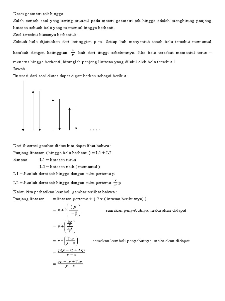 Contoh soal deret geometri tak hingga. Silahkan baca artikel barisan dan deret geometrisebelumnya juga kita telah membahas tentang barisan dan deret aritmetika bagi yang ingin mempelajarinya silahkan baca artikel barisan dan deret aritmetika. Penggunaan deret geometri tak hingga salah satunya pada masalah menghitung panjang lintasan dari pantulan bola. Maka rasio deret adalah 23. Ada dua kondisi masalah yang biasa digunakan dalam soal yaitu bola yang dilempar ke atas dan memantul sampai berhenti dan bola yang dijatuhkan dari atas dan memantul sampai berhenti. Berikut ini pejelasan lengkap tentang barisan dan deret mulai dari barisan aritmatika dan geometri deret aritmatika dan geometri deret tak hingga suku tengah sisipan disertai rumus lengkap contoh soal dan pembahasan. Di sini kamu akan belajar tentang deret geometri tak hingga melalui video yang dibawakan oleh bapak anton wardaya.