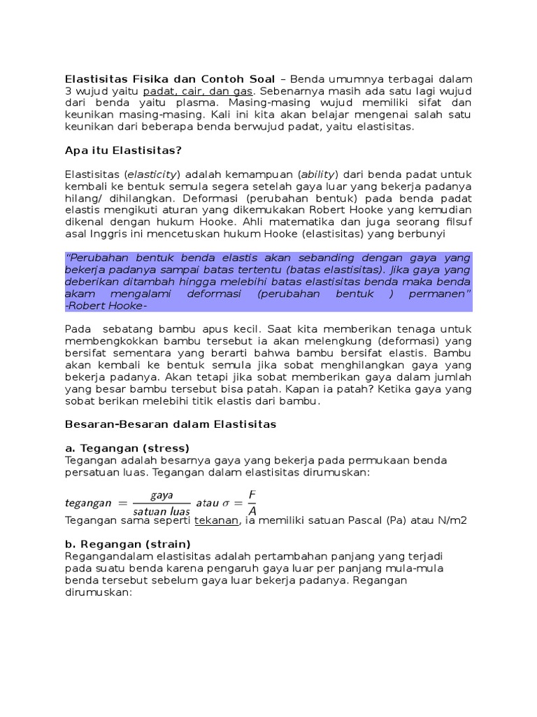 Contoh soal elastisitas fisika. Masing masing wujud memiliki sifat dan keunikan masing masing. Artikel fisika kelas xi ini menjelaskan tentang elastisitas dan hukum hooke secara lengkap mencakup modulus elastisitas rumus contoh soal dan pembahasan serta contoh penerapannya dalam kehidupan sehari hari saat sedang berkendara kamu pasti pernah melewati polisi tidur di jalan. Tercakup gaya pegas energi potensial pegas susunan seri pegas susunan paralel pegas membaca grafik fδx modulus elastisitas young dan konsep perubahan energi. Sistem alat ini dinamakan shockabsorber yang kebanyakan orang menyebutnya shockbreaker. Elastisitas fisika dan contoh soal benda umumnya terbagai dalam 3 wujud yaitu padat cair dan gas. Kali ini kita akan belajar mengenai salah satu keunikan dari beberapa benda berwujud padat yaitu elastisitas.