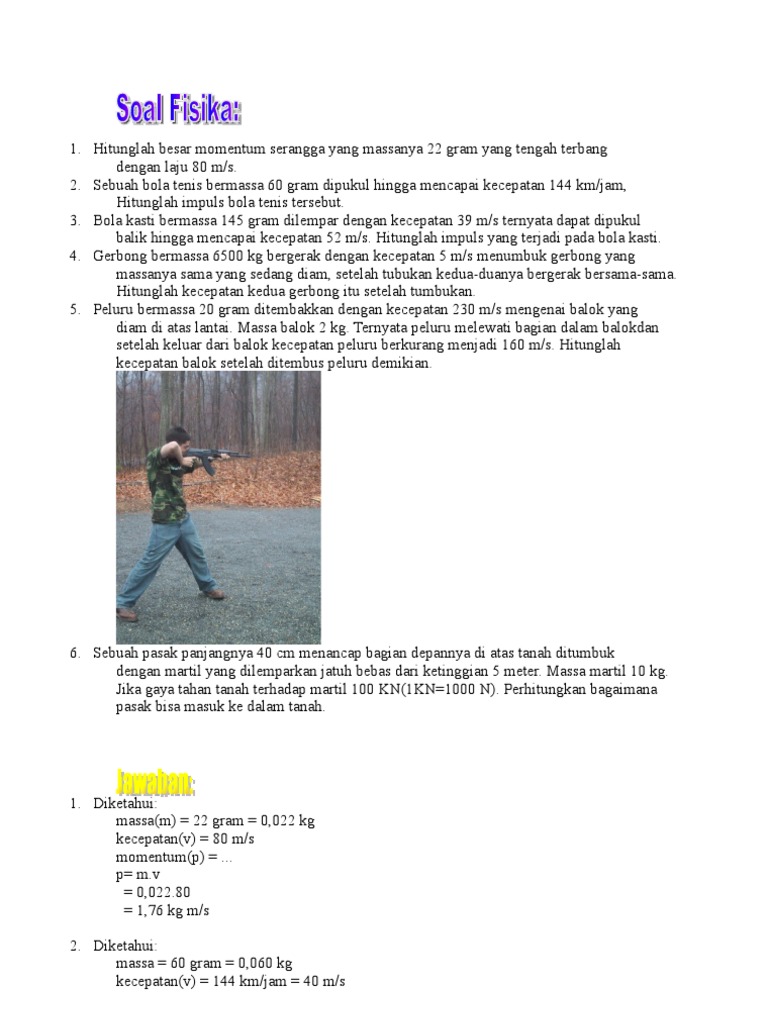 Contoh soal fisika impuls dan jawabannya kumpulan artikel. Contoh soal dan pembahasan momentum 1. Besaran 5 dinamika gerak lurus 1 dinamika gerak rotasi 3 filsafat 2 fisika 101 4 gaya gravitasi 1 getaran dan gelombang 3 impuls dan momentum 1 kinematika 6 penurunan persamaan 4 pertanyaan dasar fisika 1 praktikum elektronika digital 17 praktikum fisika 32 praktikum kimia 15 praktikum pemrograman komputer 10 sbmptn fisika 9 un fisika sma 13 un fisika sma. Berikut ini beberapa contoh soal mengenai impuls momentum dan tumbukan beserta pembahasannya. Momentum dirumuskan sebagai hasil kali massa dan kecepatan. Untuk materi dan soal lebih lengkap tentang momentum impuls tumbukan bisa dipelajari pada link berikut.