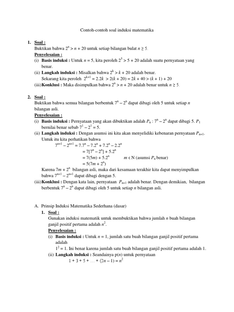 Contoh soal induksi matematika kelas 11 beserta jawabannya. Gunakan induksi matematika untuk membuktikan rumus. Pertama kita harus menunjukkan bahwa rumus tersebut benar ketika n 1. Soal induksi matematika ini adalah salah satu hal yang wajib kamu tahu dimana admin blog soal kunci jawaban menyampaikan soal induksi matematika kepada teman teman semua yang saat ini mencari soal induksi matematika dengan ini maka kamu akan tahu selengkapnya pembahasan soal induksi matematika tersebut. Untuk n 5 kita peroleh 25 5 20 adalah suatu pernyataan yang benar. Contoh soal induksi matematika beserta jawabannya materi kelas 11 contoh soal induksi matematika pada video ini akan membantu kalian untuk memahami lebih baik lagi mengenai metode pembuktian. Soal induksi matematika ini adalah salah satu hal yang wajib kamu tahu dimana admin blog soal kunci jawaban menyampaikan soal induksi matematika kepada teman teman semua yang saat ini mencari soal induksi matematika dengan ini maka kamu akan tahu selengkapnya pembahasan soal induksi matematika tersebut.