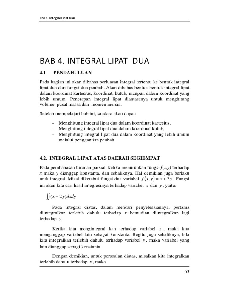 63 41 pendahuluan pada bagian ini akan dibahas perluasan integral tertentu ke bentuk integral lipat dua dari fungsi dua peubah. Soalnya seringnya remidi pas materi ini. Hitung luas daerah yang dibatasi oleh x y 2 dan 2y x y. Akan dibahas bentuk bentuk integral lipat dalam koordinat kartesius koordinat kutub maupun dalam koordinat yang lebih umum. Contoh soal dan pembahasan tentang integral widi wednesday 22 february 2017 bicara soal integral pasti dipikiran kalian materi ini susah banget. Bab 4 integral lipat dua1 2 1.